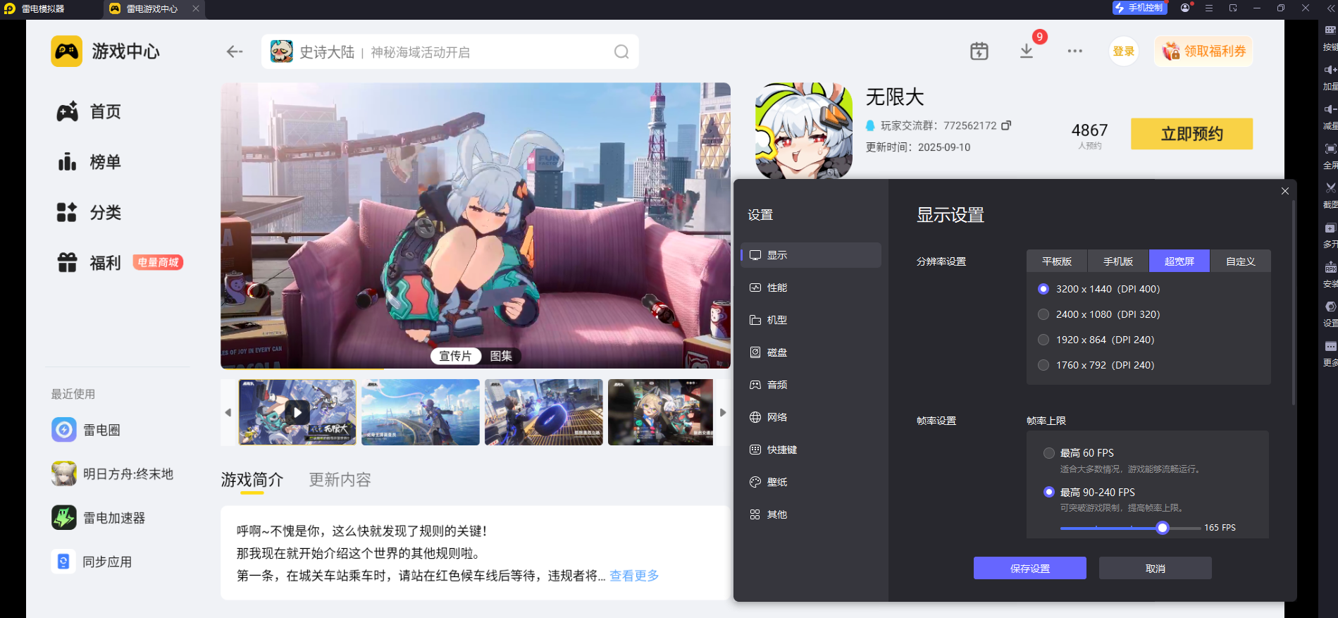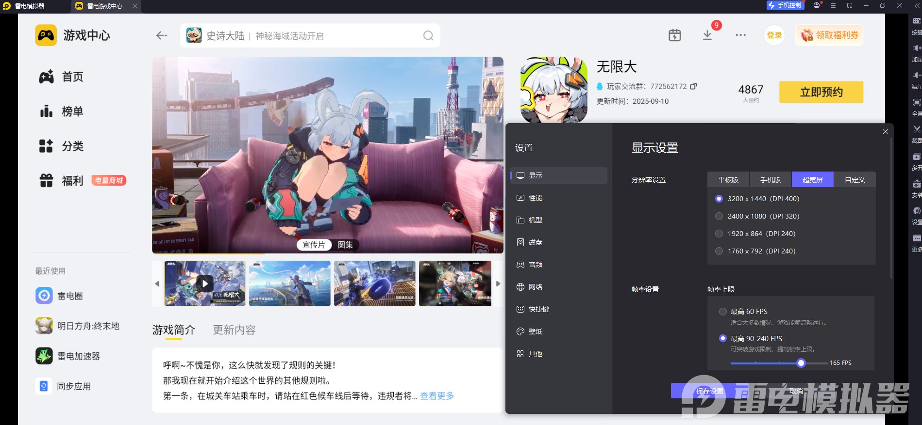 由于无限大地图场景丰富,细节满满,雷电模拟器能让这些画面优势更突出。模拟器支持4K高清渲染,无论是城市建筑的纹理、异星地貌的奇特景观,还是角色技能释放的粒子效果,都能清晰呈现,不会因屏幕尺寸限制错过细节,让玩家更好地沉浸在无限大地图的冒险中。