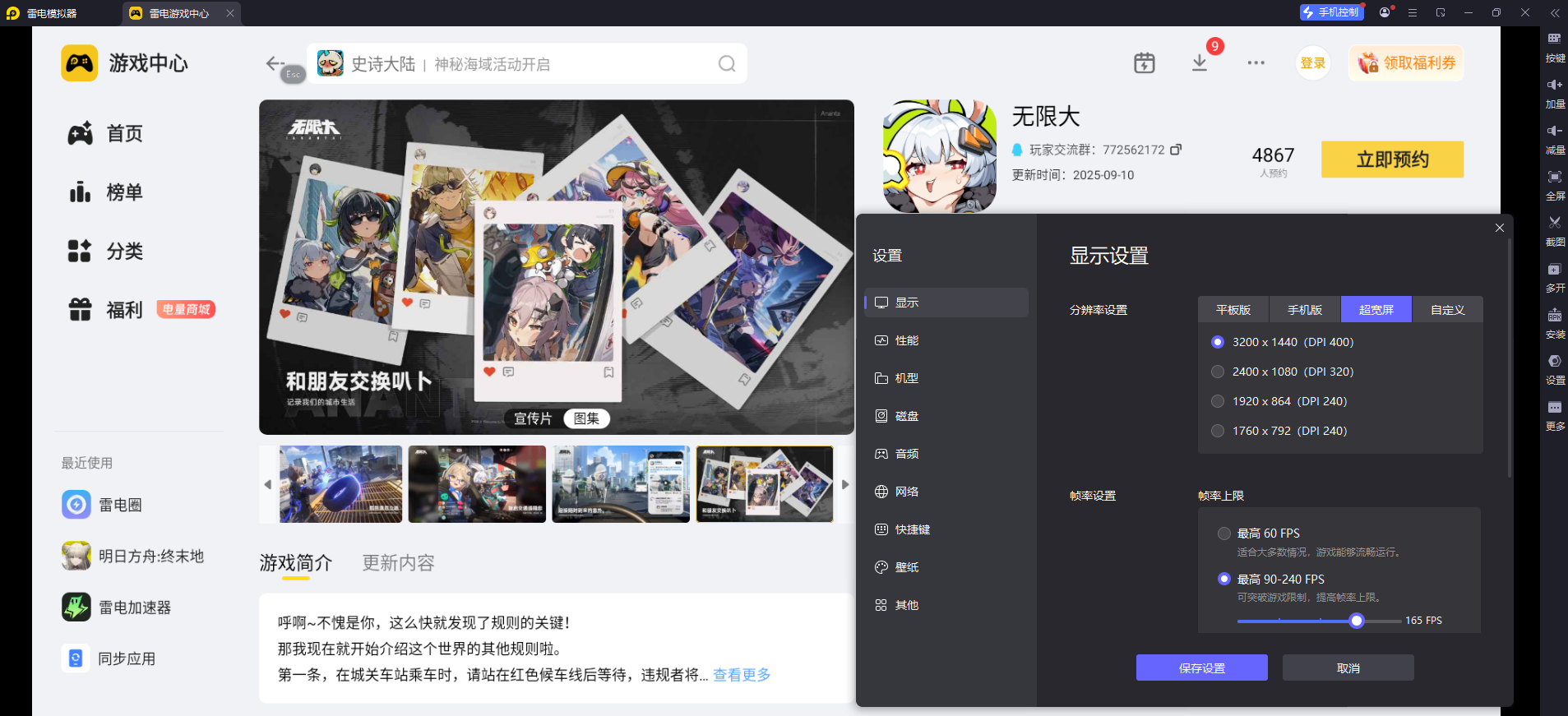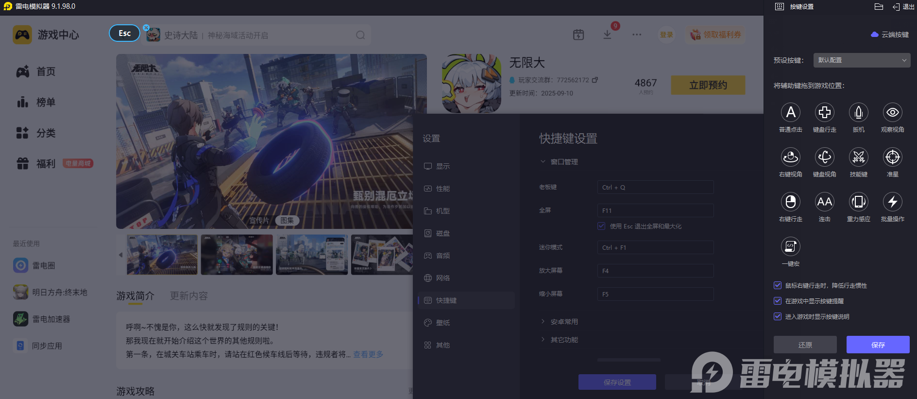 《无限大》的核心玩法包括飞檐走壁、载具驾驶和连招战斗,需要精准的操作反馈。雷电模拟器支持键盘鼠标自定义映射,玩家可根据习惯设置技能按键和移动方式,无论是钩锁穿梭摩天楼,还是战斗中切换武器连招,都能实现精准操控,比触屏操作更灵活。