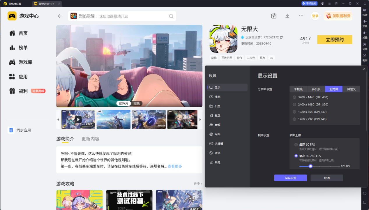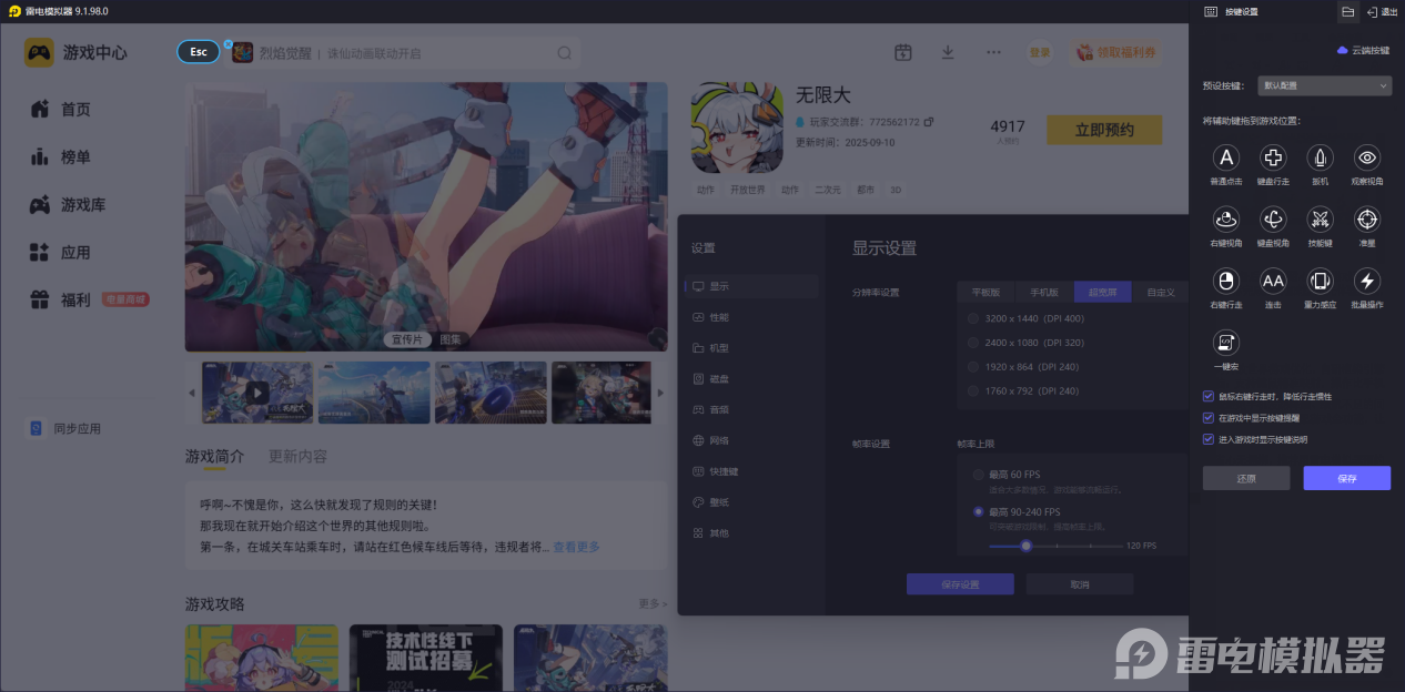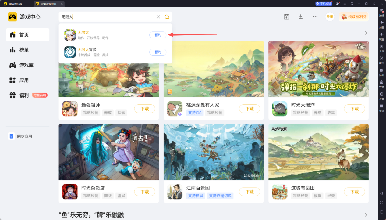 启动模拟器后,直接打开内置的雷电游戏中心。在搜索框输入“无限大”在搜索结果中找到对应游戏,点击预约,等游戏正式上线后系统会自动下载安装好,全程无需手动干预。安装后游戏图标会显示在桌面,点击即可开启冒险。该流程操作极简,新手也能快速上手,带你轻松进入游戏世界。