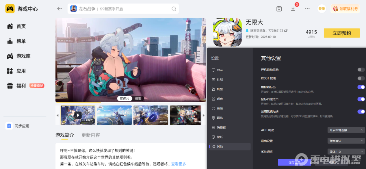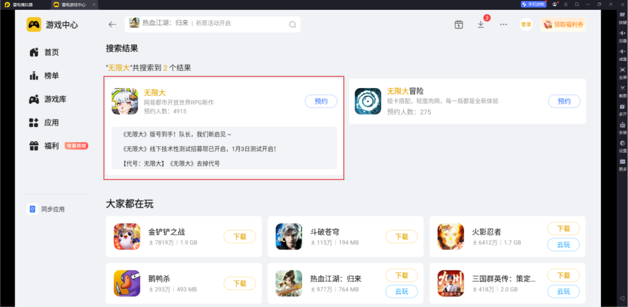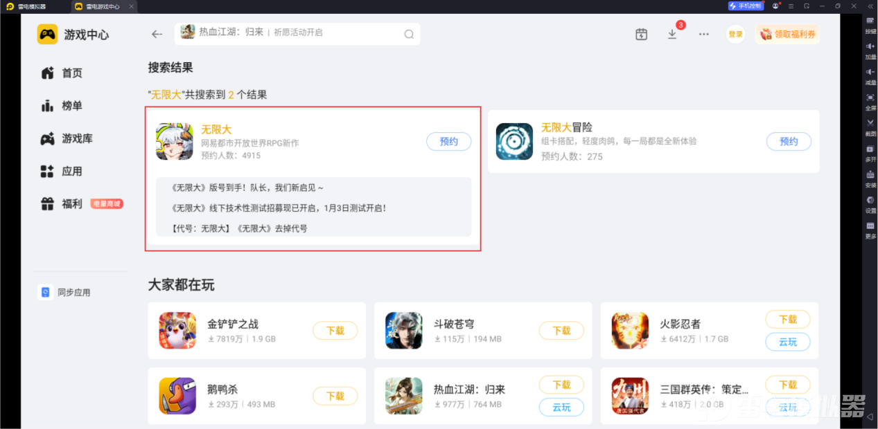 想要安全、快速下载安装《无限大》,推荐大家使用雷电模拟器。它内置正规游戏库“雷电游戏中心”,搜索《无限大》就能找到官方安装包,然后点击预约即可,步骤简单易懂,新手也能快速完成,全程安全放心,轻松开启游戏。