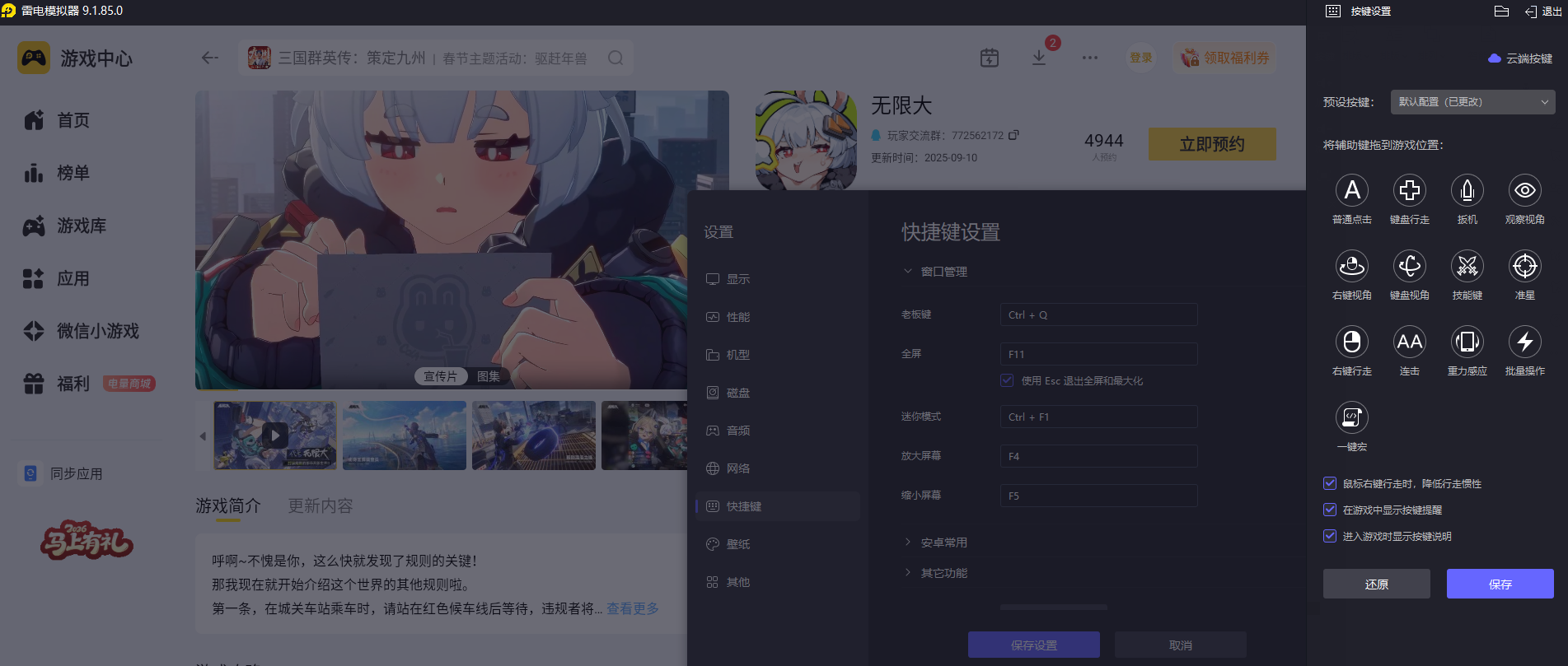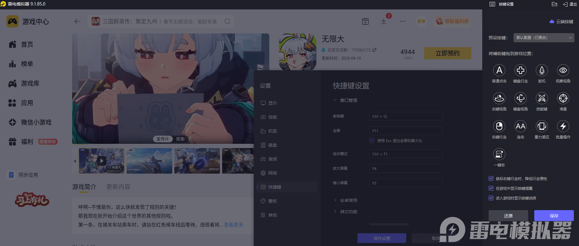 《无限大》里有自由移动、战斗释放技能、和NPC互动、探索场景等多种操作,需要精准、灵活的控制才能顺利完成各类玩法。雷电模拟器能优化操作逻辑,支持键鼠自定义映射,让按键操控更贴合玩家的使用习惯,不管是快速穿梭城市,还是精准释放战斗技能,都能更顺畅完成,摆脱手机操作的局限,让玩家更轻松地应对游戏里的各类挑战,操作过程更顺手。