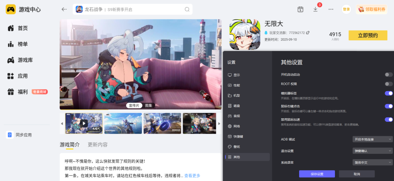《无限大》拥有精致的都市场景、细腻的角色造型,还有丰富的光影特效与细节设计,需要足够清晰的画面展示,才能让玩家感受到游戏的视觉美感。雷电模拟器可以完美适配游戏的高清画质参数,将城市的建筑、街道的细节、角色的神态在4K分辨率下都完整清晰地展现出来,让每一处画面都更有质感,玩家能沉浸式感受游戏打造的真实都市世界,视觉体验更完整。