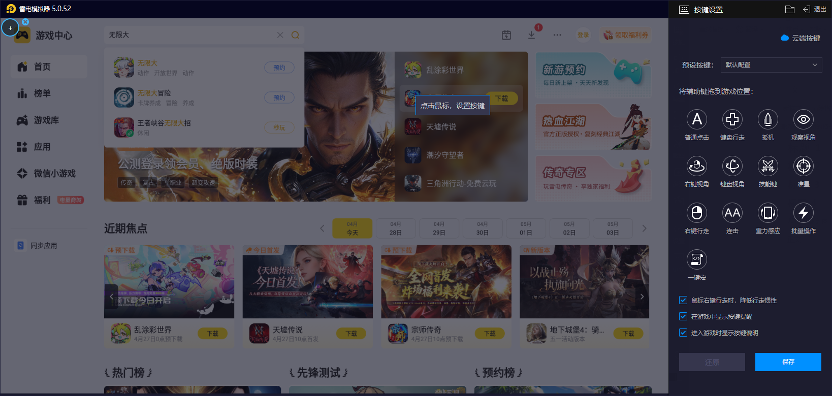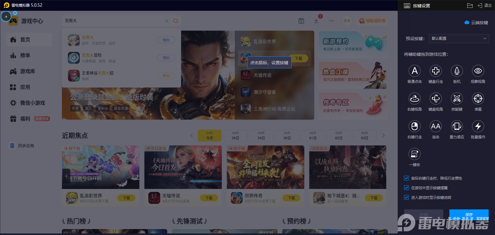 很多玩家对于手游的操作方面还是很注重的,尤其是在使用电脑体验的时候,为此雷电模拟器给我们带来了键位自定义功能,支持宏按键、一键连招及自定义按键绑定,玩家可根据无限大的多元玩法,如探索、战斗、解谜自由设置操作方案。如念力操控、摆荡移动绑定至键盘快捷键,或为复杂技能组合设置一键连招,简化操作流程,让小伙伴们的打击效率上也能更高。