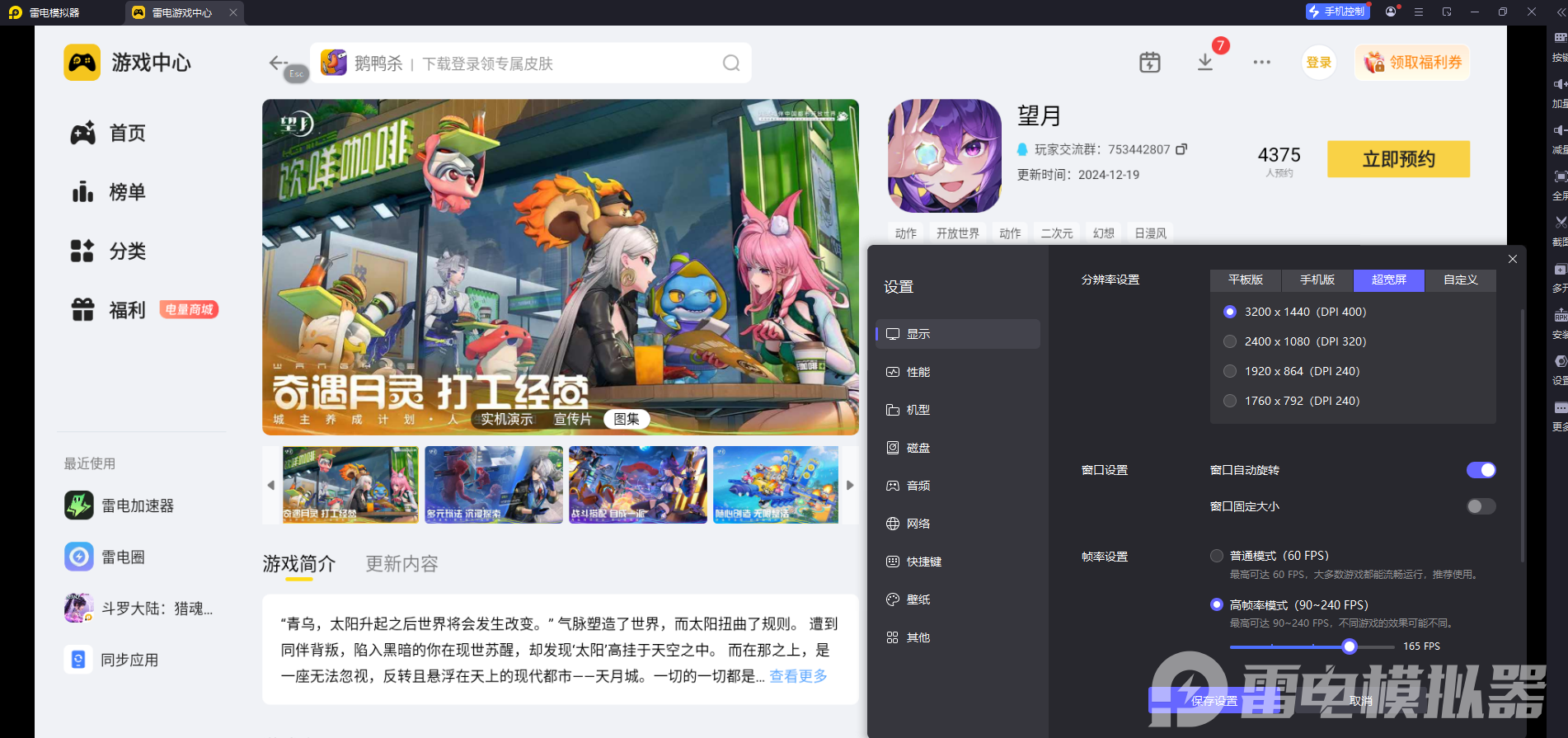 雷电模拟器支持165稳定帧率模式,用它玩《望月》,极驰001的车身线条、行驶时的光影特效都能清晰呈现,比手机屏幕看得更清楚。而且4K大屏显示能完整展现城市路况,驾驶极驰001探索时,远处的道路和障碍物一目了然,不用频繁缩放屏幕。