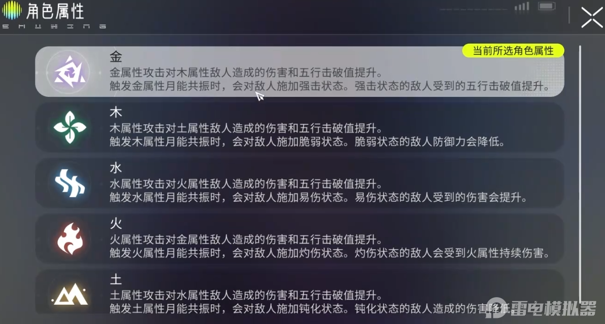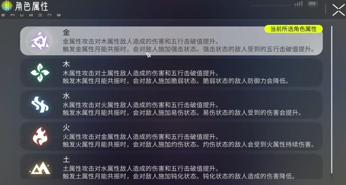 金属性:克制木属性敌人,触发月能共振后给敌人施加强击状态,提升其受到的五行击破值;