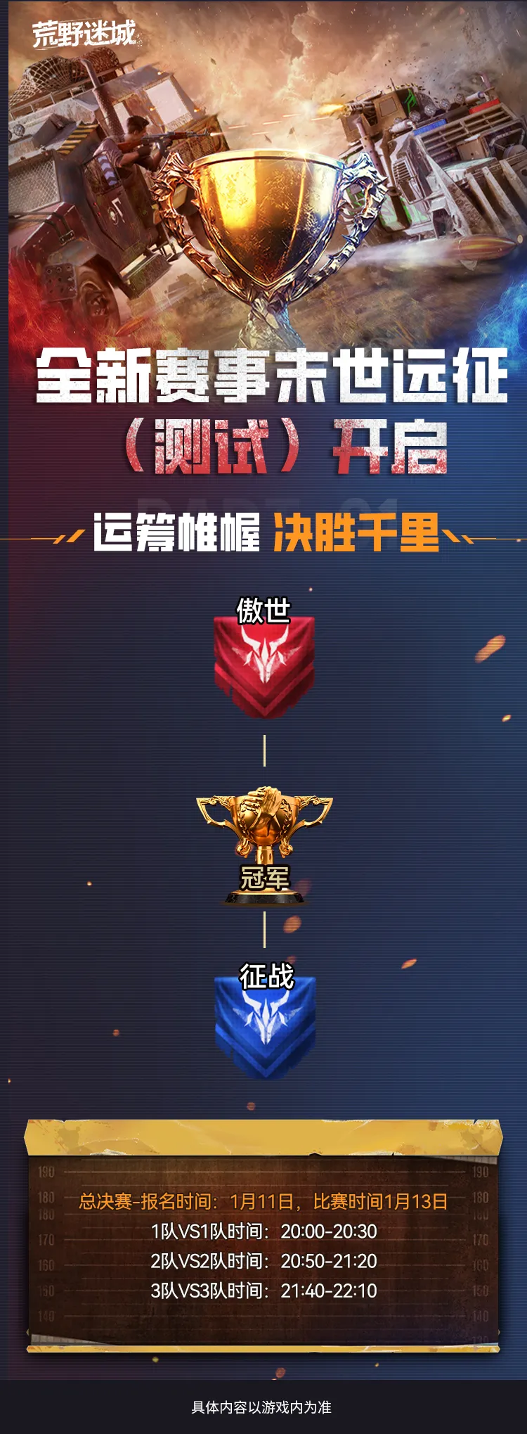 总决赛-报名时间:1月11日,比赛时间1月13日1队VS 1队时间:20:00-20:302队VS 2队时间:20:50-21:203队VS 3队时间:21:40-22:10