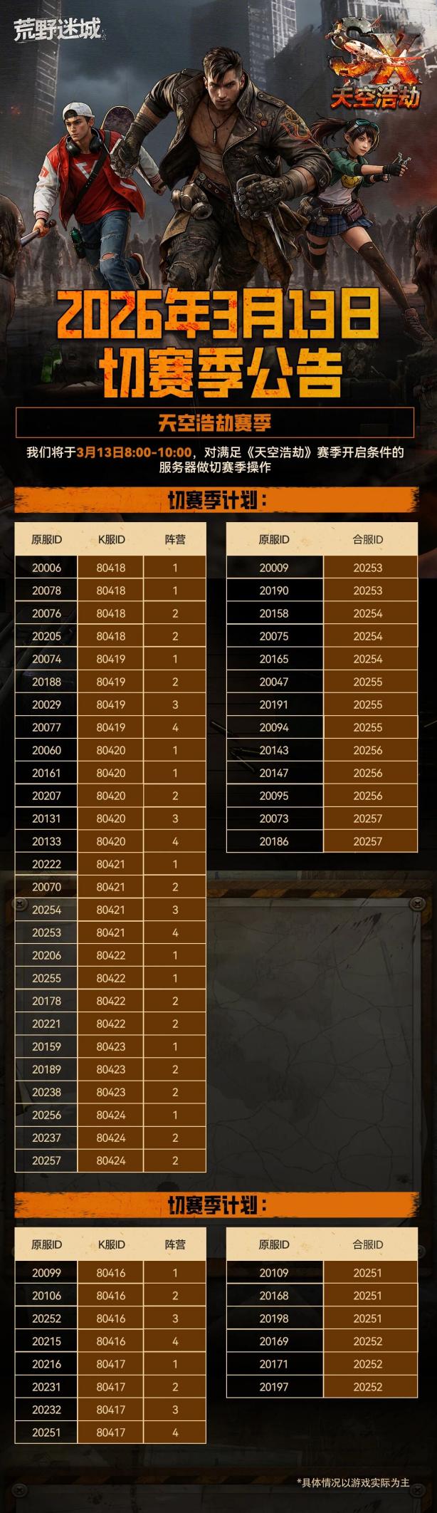 我们将于03月13日8:00-10:00,对满足《天空浩劫》赛季开启条件的服务器做切赛季操作!具体参考如下图例介绍: