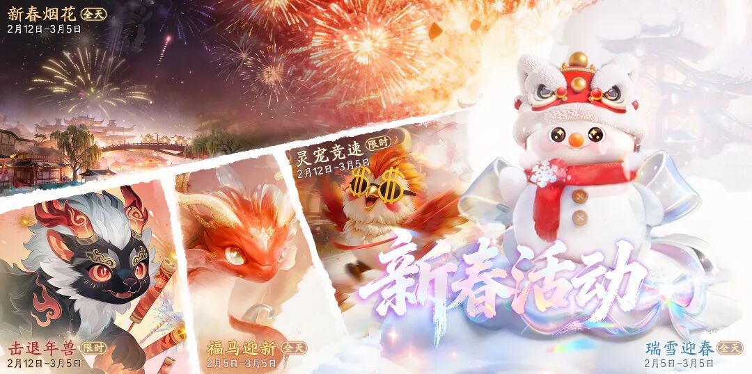 (1)每次堆雪人后可获得【新春福币】,可在活动界面左下角打开「福币商店」兑换奖励,包含唤仙符、寻宝券、元尊精华、高级聚灵丹等好礼,2月12日起可兑换新春限定背饰【蓬蓬马(永久)】、春节烟花·小等好礼!