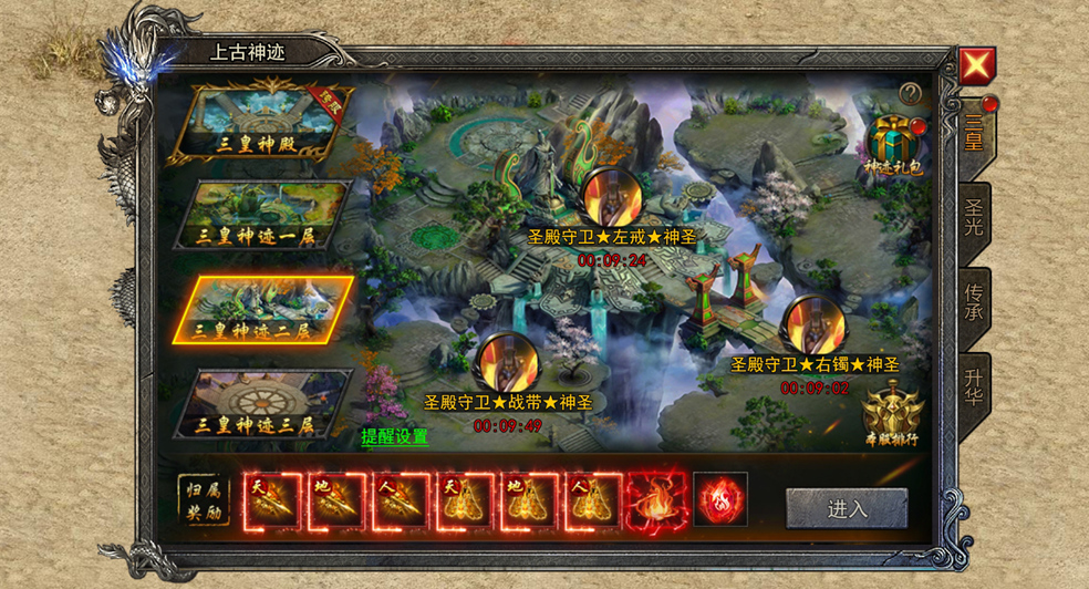 三皇神殿(跨服地图)和三皇神迹(本服地图)中的所有BOSS均有概率掉落传承装备与稀有道具(包括传承之火、传承精粹)。