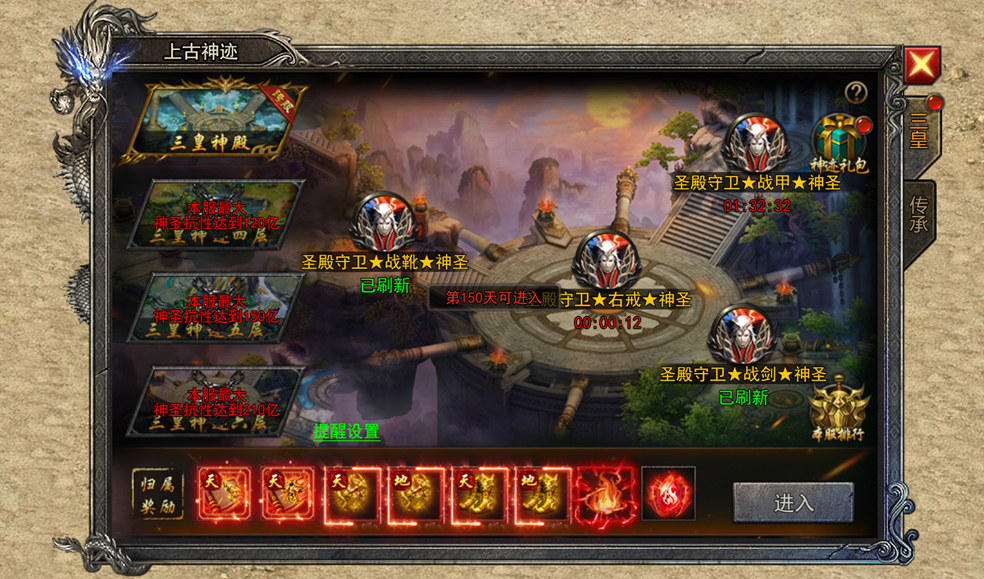 每日19:00,三皇神殿地图准时刷新。挑战的关键在于必须优先清除神殿内所有的“圣殿神将★分身”!只有成功消灭所有分身,才能对【神迹】圣殿神将本体造成有效伤害。最后成功击杀【圣殿神将★主神】BOSS的归属者及其所在行会成员,将获得行会归属奖励。其他参与挑战的玩家可获得参与奖励。
