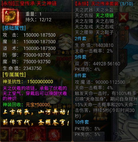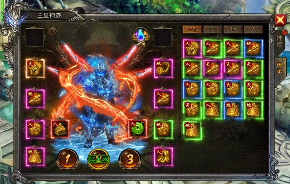 传承装备共分五大品质等级,由低至高依次为:精锻、稀世、传说、神工、永恒。永恒为最高品质。而三皇装备分为人皇、地皇、天皇三大系列,玩家可自由组合搭配,激活不同效果。随着游戏进程推进,每个玩家最多可解锁三套装备方案。切换装备方案的操作仅限于在盟重城内进行。