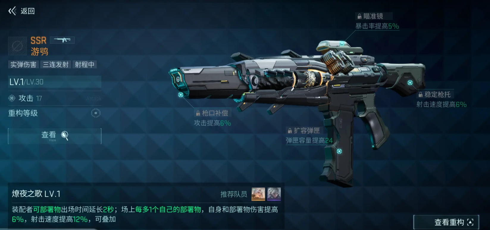 据了解,目前游戏内也有带来一些较为特色的武器选择,比如游鸮便是其中之一,作为SSR级武器,拥有“燎夜之歌”被动,装备后可让部署单位的出场时间延长,额外增加一次部署机会,同时自身及部署物的伤害提升6%,射击速度提升12%,且该状态可以去进行多层叠加。