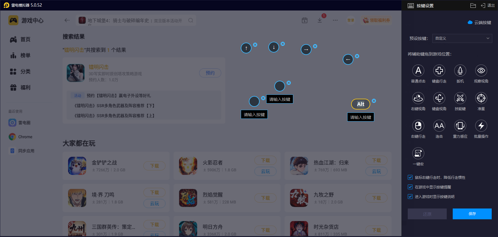 为了能让玩家更好的去进行布局与战斗,包括技能等方面的使用,建议是去选用雷电模拟器来帮自己运行,其中的按键方面自定义功能可让我们根据自身习惯设置,比如可以直接把移动、攻击、技能释放等基础的操作对应到键盘和鼠标上,相比手机触屏操作更加精准、快速,能有效提升操作效率和实际的游戏体验效果。