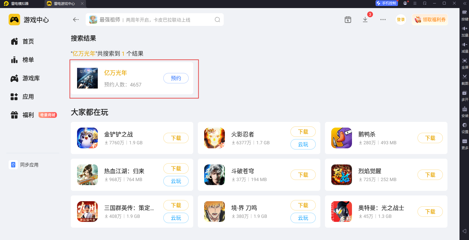 玩《亿万光年》手游,小编推荐大家使用雷电模拟器!它针对星际策略类手游做了专项优化,和《亿万光年》的适配度拉满,能完美还原游戏核心玩法,让电脑端体验不输手机。不管是日常探索星系,还是参与大规模舰队对战,雷电模拟器都能提供稳定的运行支持,是玩《亿万光年》的优质选择。大家只需要打开浏览器,进入官网下载雷电模拟器,然后再雷电游戏中心搜索该游戏预约即可。