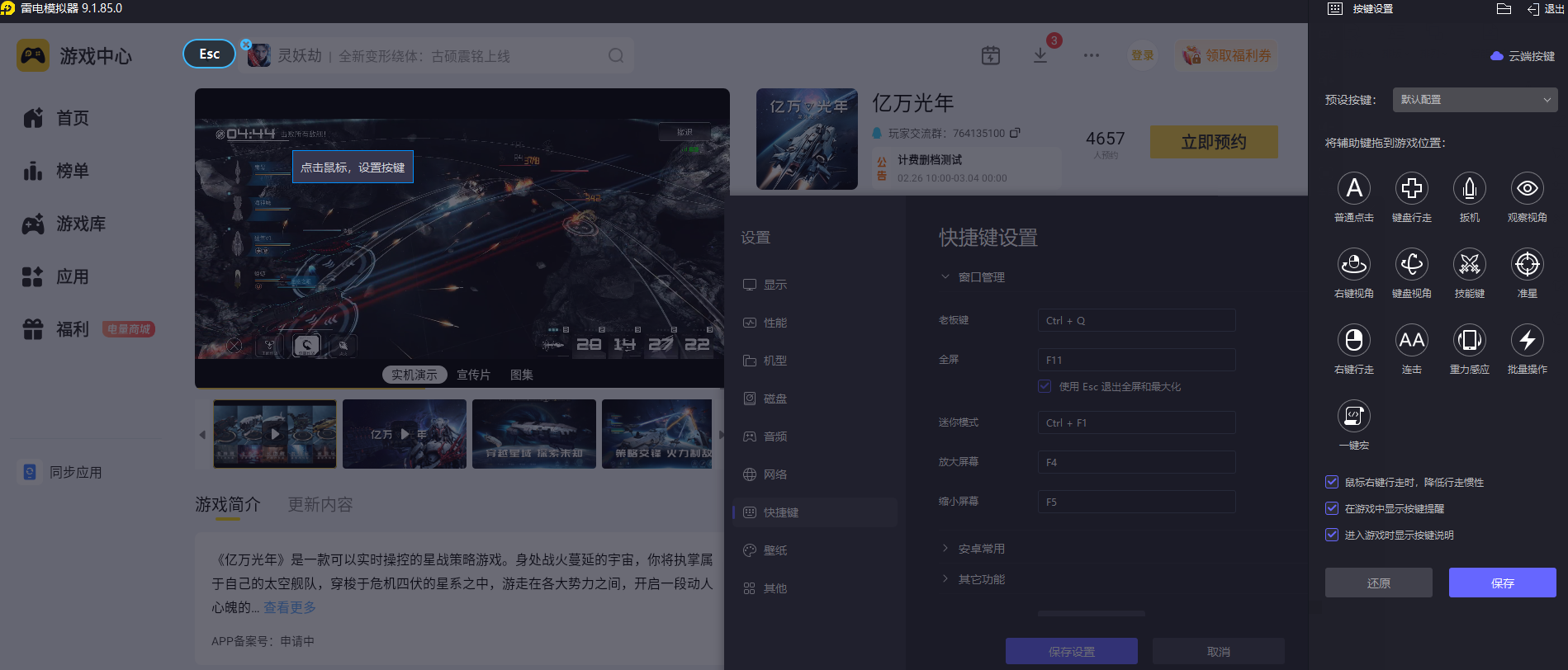 《亿万光年》采用实时操控玩法,需要玩家快速框选舰队、规划进攻路线,还得灵活调整舰船走位躲避攻击,多线战场的指挥更考验操作精准度。雷电模拟器的键鼠映射功能刚好适配这些需求,玩家可自定义键位布局,用鼠标拖拽就能轻松框选舰队,键盘快捷键能快速释放战术技能,响应速度快且操作精准。