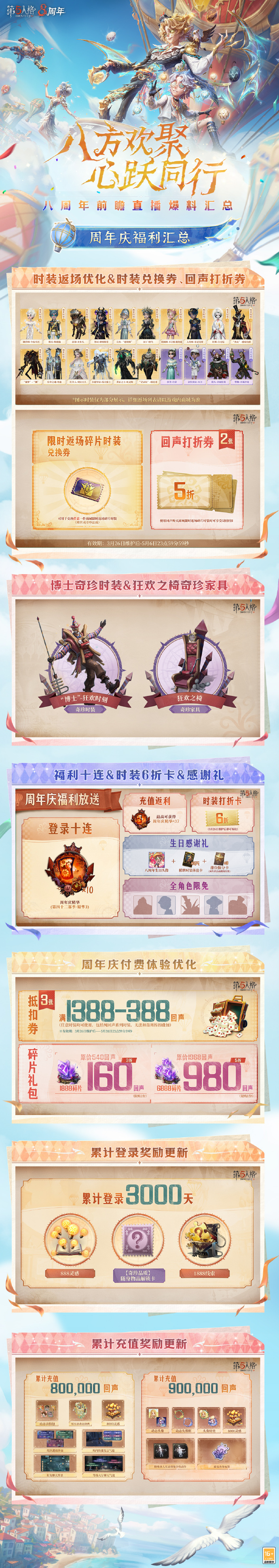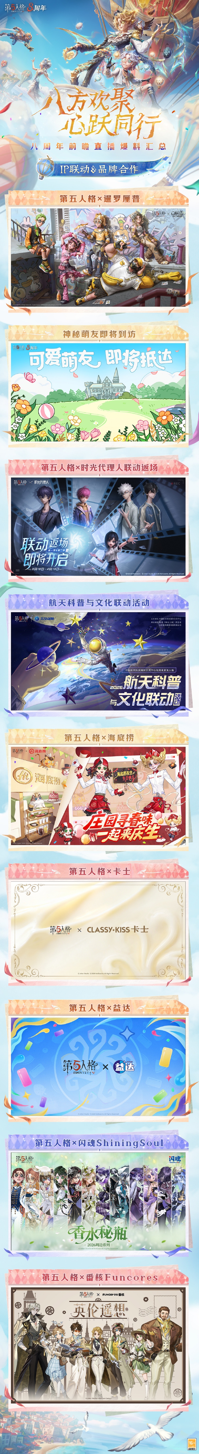 八方欢聚,心跃同行。第五人格八周年前瞻直播爆料汇总来啦~点击长图即可了解:图1:周年庆福利汇总图2:周年庆系列活动图3:赛事活动&游戏体验优化图4:全新时装&全新赛季图5:IP联动&品牌合作