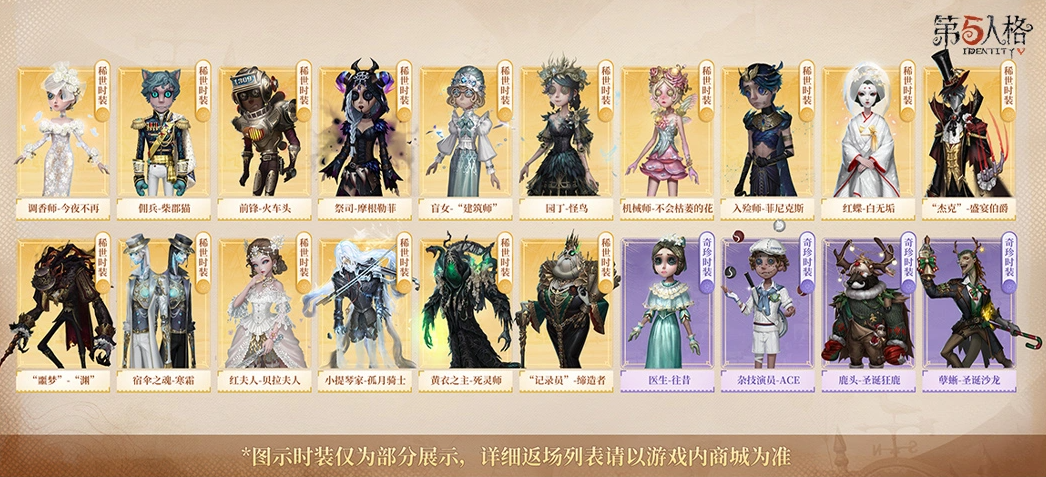解锁卡能通兑返场金、紫皮,但优先换金皮是最优选择。园丁的怪鸟作为周年剧情限定金皮,造型设计极具特色,视觉表现惊艳,是庄园收藏党必入款;机械师的“不会枯萎的花”融合机械与玫瑰元素,情人节主题的设计让这款皮肤颜值拉满;老牌经典金皮同样是首选,红夫人的贝拉夫人、红蝶的白无垢、调香师的今夜不再,都是角色的代表款,手感与颜值双在线,适配各类对局场景。