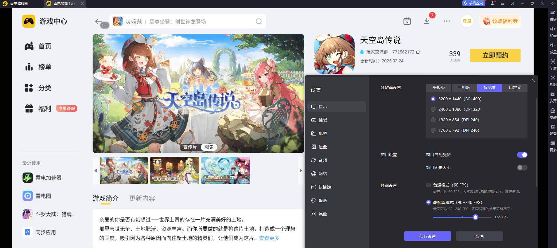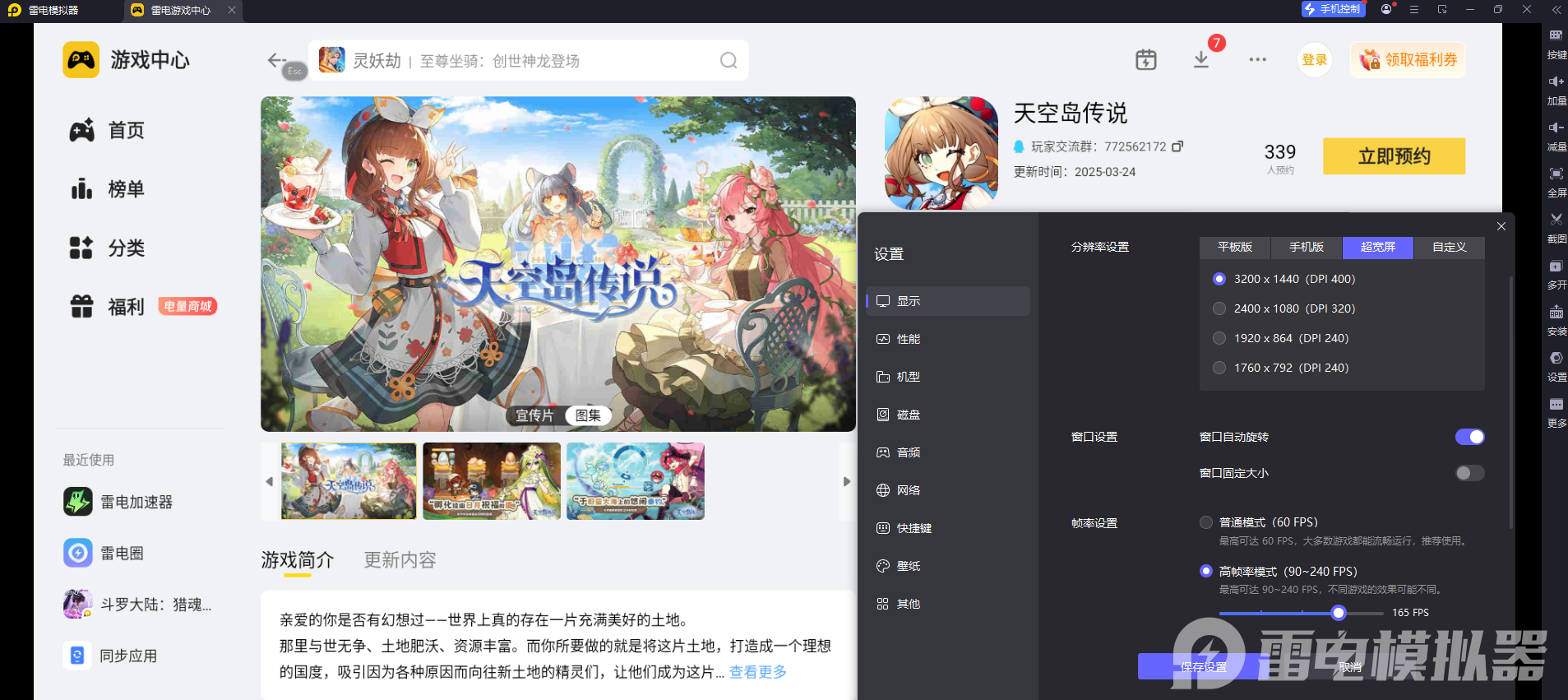 游戏本身的3D场景和细腻画质,在手机小屏上容易错过细节。雷电模拟器支持4K高清分辨率和165稳定帧率模式,能将天空岛的漂浮岛屿、精灵建模、建筑装饰等细节完整呈现,色彩更鲜亮通透。不管是浏览岛屿全景,还是战斗时的技能特效,都能带来更沉浸的视觉体验,比手机更能凸显游戏的治愈画风。