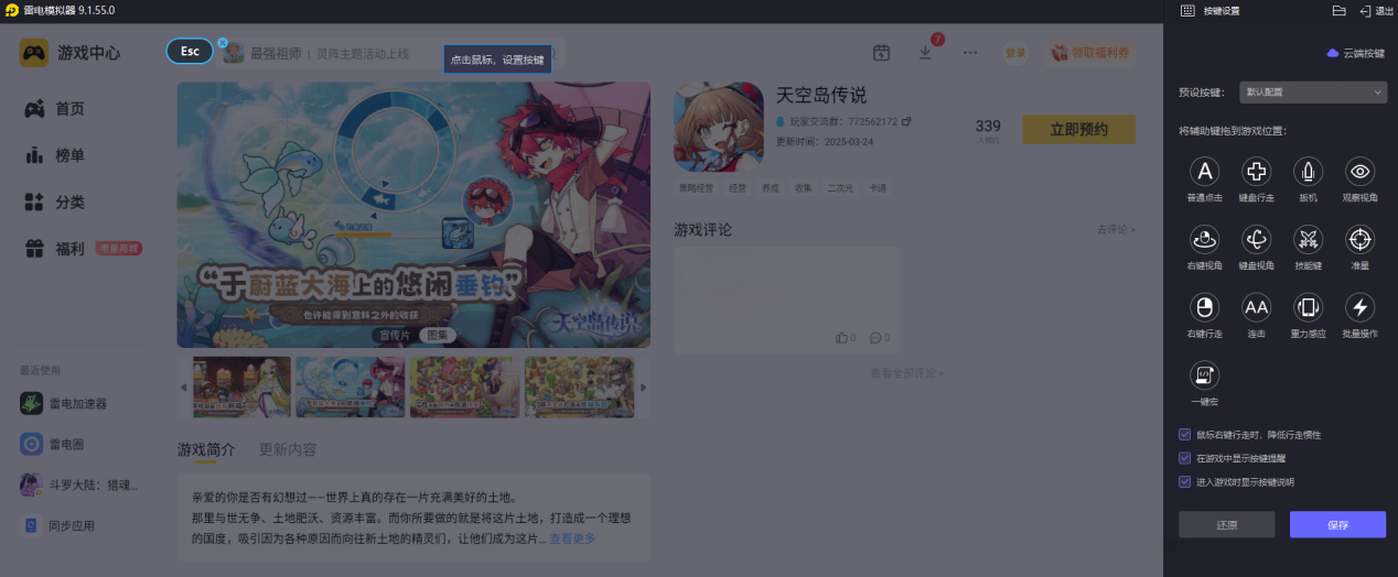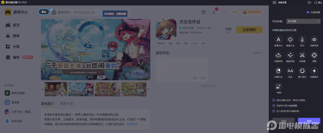 游戏的岛屿建造需要精细摆放建筑、划分地块,实时战斗则需要灵活释放技能。雷电模拟器的键鼠映射功能适配性强,能自动匹配预设键位,也支持自定义设置。用鼠标拖拽摆放建筑更精准,键盘按键释放技能更快捷,让操作更顺手高效。