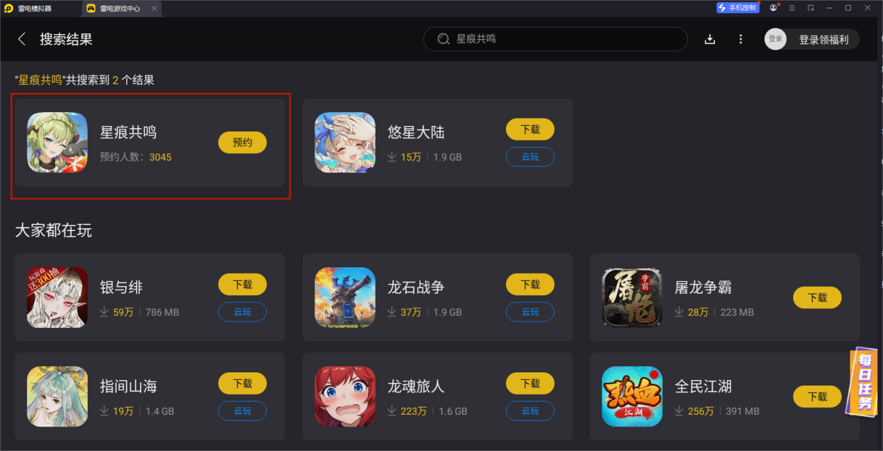 下载完成后启动雷电模拟器→ 打开雷电游戏中心→ 搜索星痕共鸣。