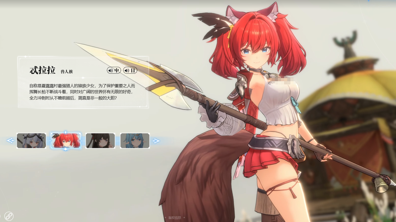 夏露露村的兽人族以狩猎为生:狼族少女忒拉拉自称「最佳猎人」,性格直爽豪迈,擅长长枪战斗与机关技术,冲刺时勇往直前,毛茸茸的尾巴总在害羞时派上用场。