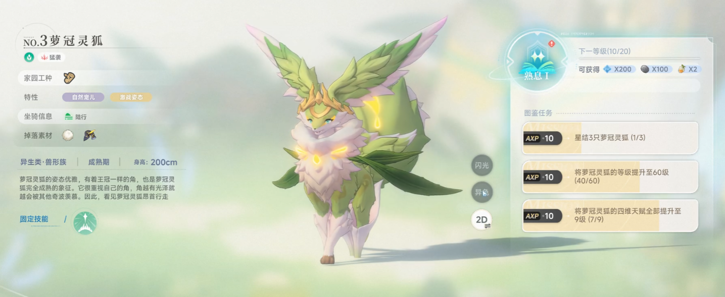 小芽狐的外形会随着进化不断变化,颜值越来越高。幼年期的它小巧可爱,毛茸茸的样子让人忍不住喜欢;第一次进化后变成“蓬尾狐”,体型变大,姿态变得优雅,毛发也更蓬松顺滑;最终进化成“萝冠灵狐”时,不仅体型大幅增长,头上还会出现小皇冠,像个威风凛凛的小boss,颜值直接拉满。