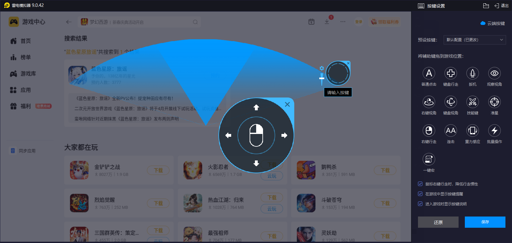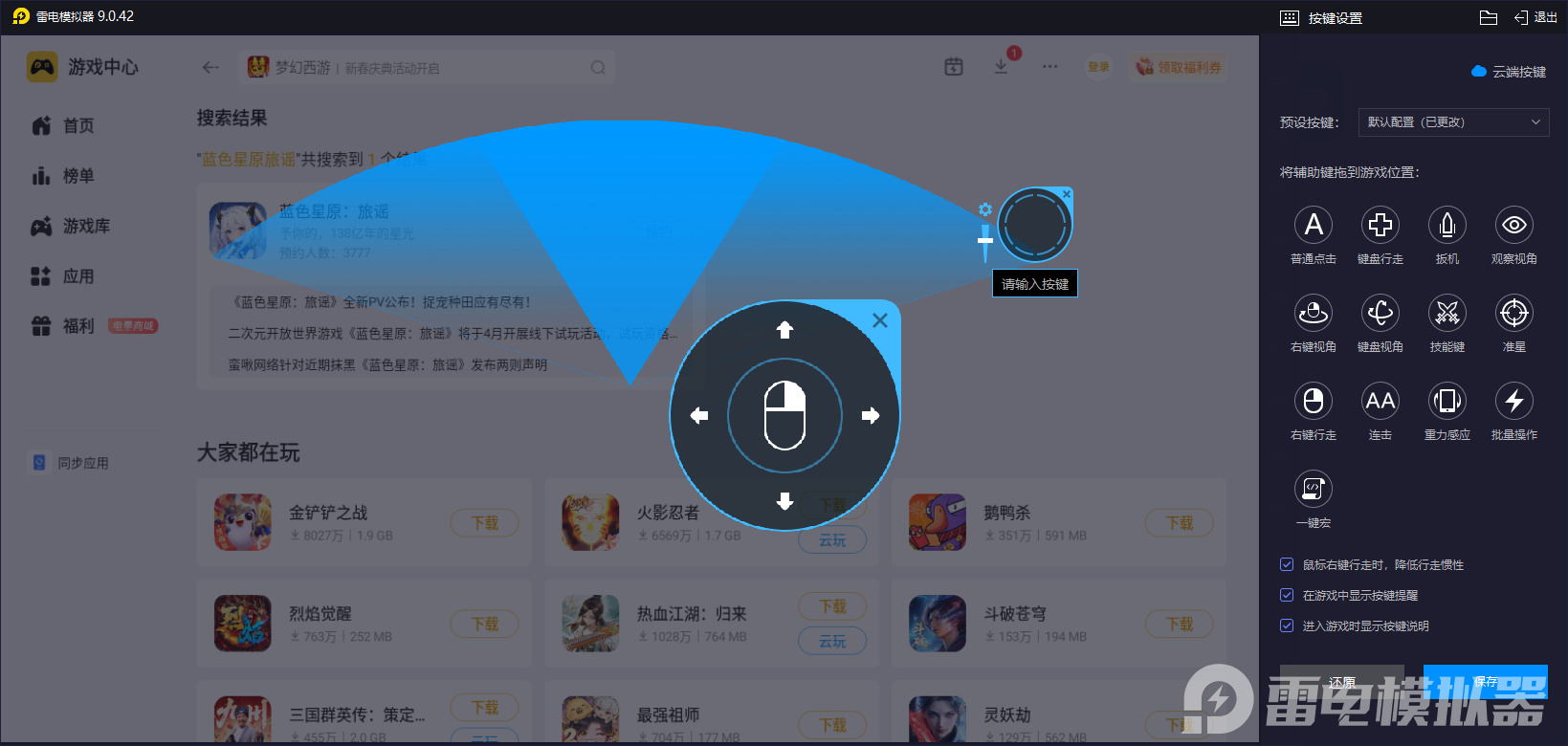 我们在游戏内,碧羽灵龙的飞行是核心玩法,手机触屏虚拟摇杆是非常容易出现操作偏差的,导致转向迟缓、高度控制不稳,而雷电模拟器支持的键鼠自定义功能,就可以让我们把飞行操作绑定至asdw键,精准控制飞行方向与高度,鼠标拖动的方式去调整视角也更便利,而且,核心输出技能还可以设置为数字键,让玩家快速精准释放技能,在战斗中及时触发暴击增益、衔接连携技,避免错过关键输出时机。