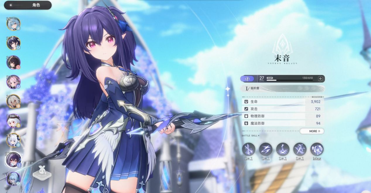 傲娇双马尾造型,使用弓箭远程攻击。她的射击速度快,普攻频率高,持续输出能力不错,远程压制效果明显,在后排可以稳定为团队提供伤害支援。