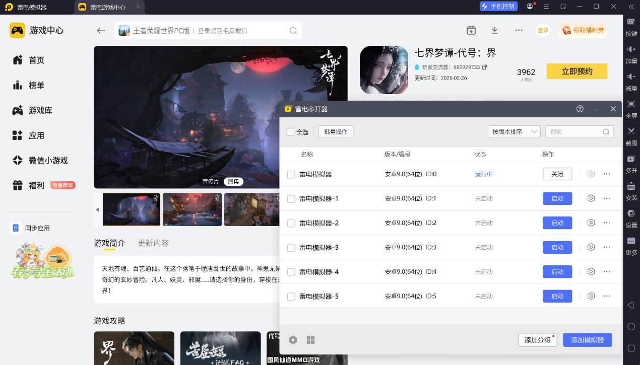 雷电模拟器的多开功能很适合体验七界梦谭的玩家,该功能支持同时开启多个游戏账号,不管是官服还是渠道服版本,都能在模拟器内直接下载安装。搭配同步器工具,可对多开的窗口进行批量操作,方便玩家同时完成多个账号的每日任务,高效刷取游戏内的各类资源,不用反复切换设备或账号,大幅提升日常游玩的效率。