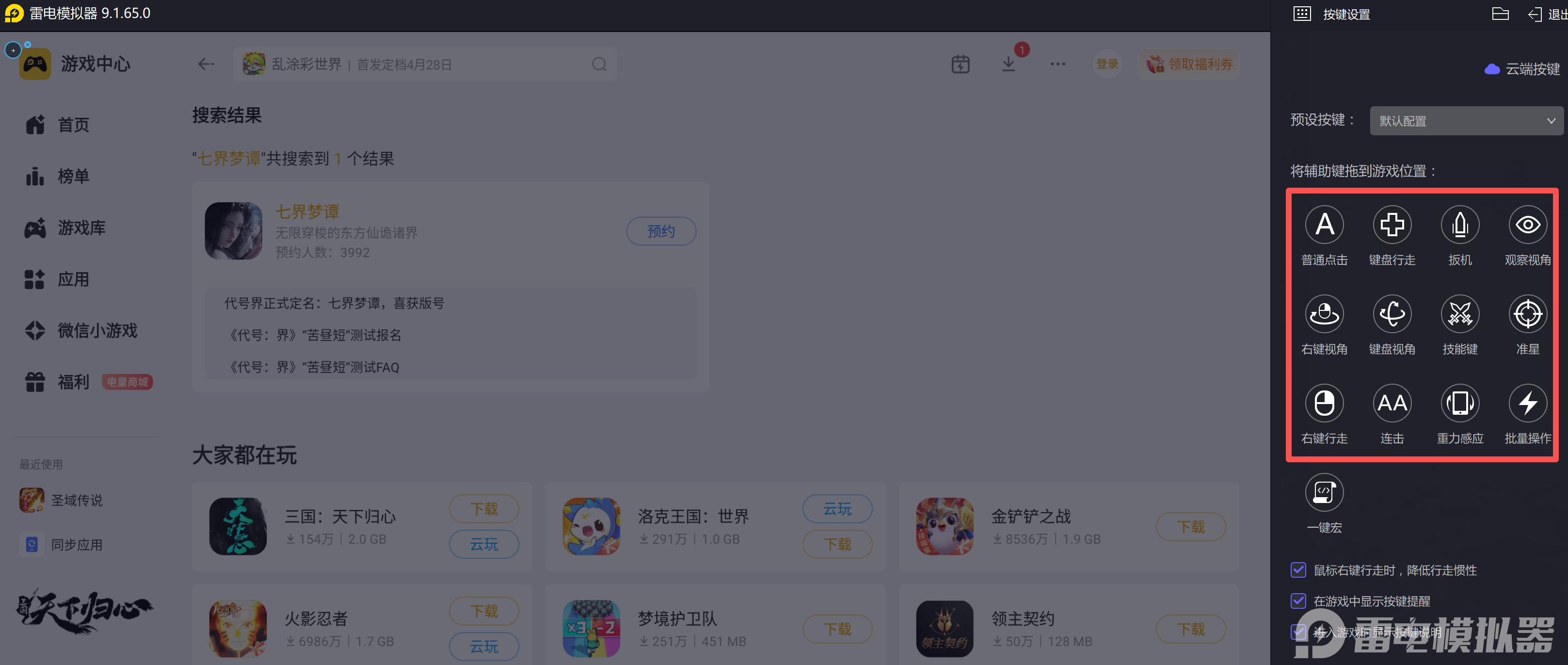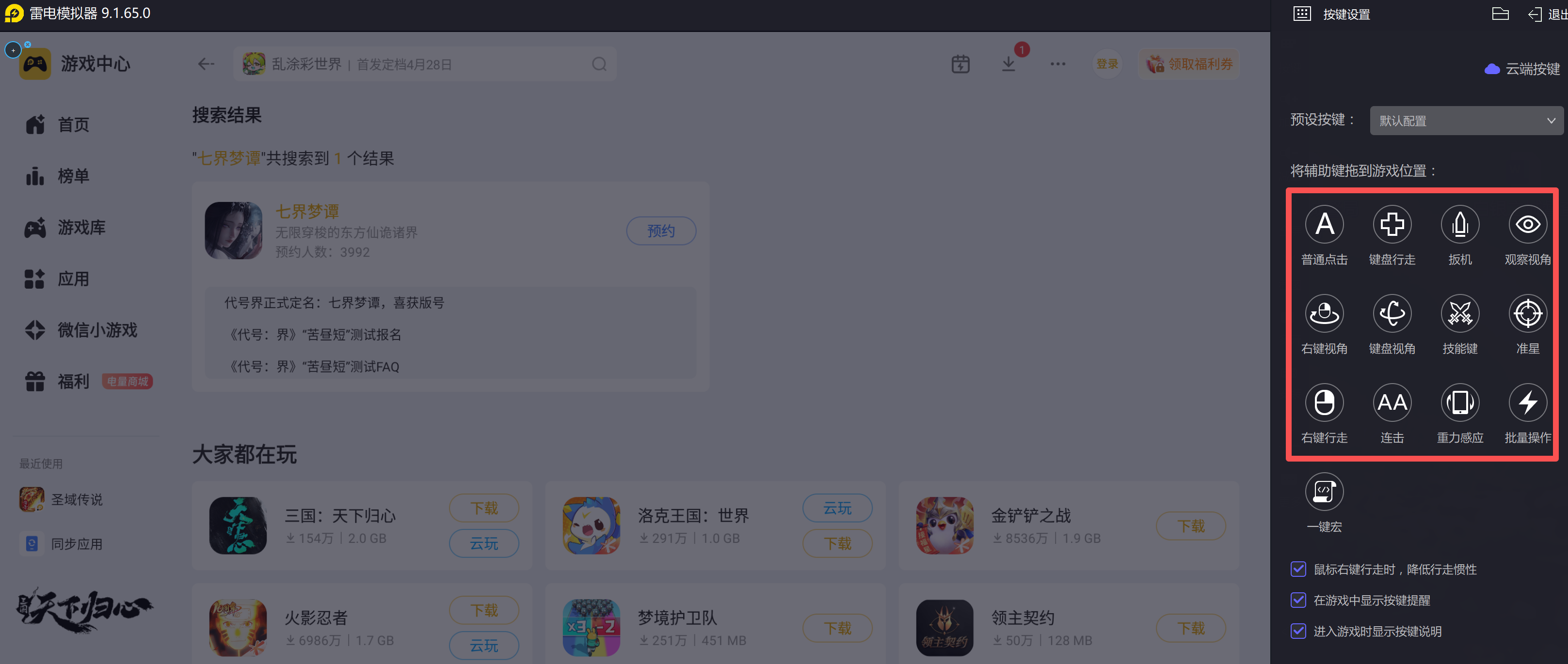 在战斗系统中,无论是进行飞行浮空斗法,还是参与符篆、夺舍这样的神仙打架,如果玩家想加快游戏进程,简化操作步骤,顺利完成任务,其实方法很简单,只需要通过雷电模拟器右侧的“按键自定义”功能,就可以轻松实现了。彼时,需要玩家在游戏开始前,先根据自身习惯,和游戏要求,对基础按键,重新组合设定,为七界梦谭设置专属快捷键即可。