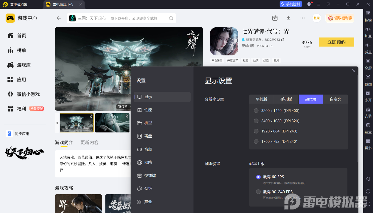 雷电模拟器的超宽屏模式,能优质适配七界梦谭的开放世界与中式美术风格。查看角色立绘时,超宽屏可以呈现更多细节,让角色设计与服饰纹理更完整地展现。战斗与探索场景中,更开阔的画面视野不会被UI元素遮挡,能清晰观察秘境环境、精怪位置与技能范围,不管是穿梭诸界探索还是参与斗法,都能获得更完整的视觉感受,提升整体游戏沉浸感。