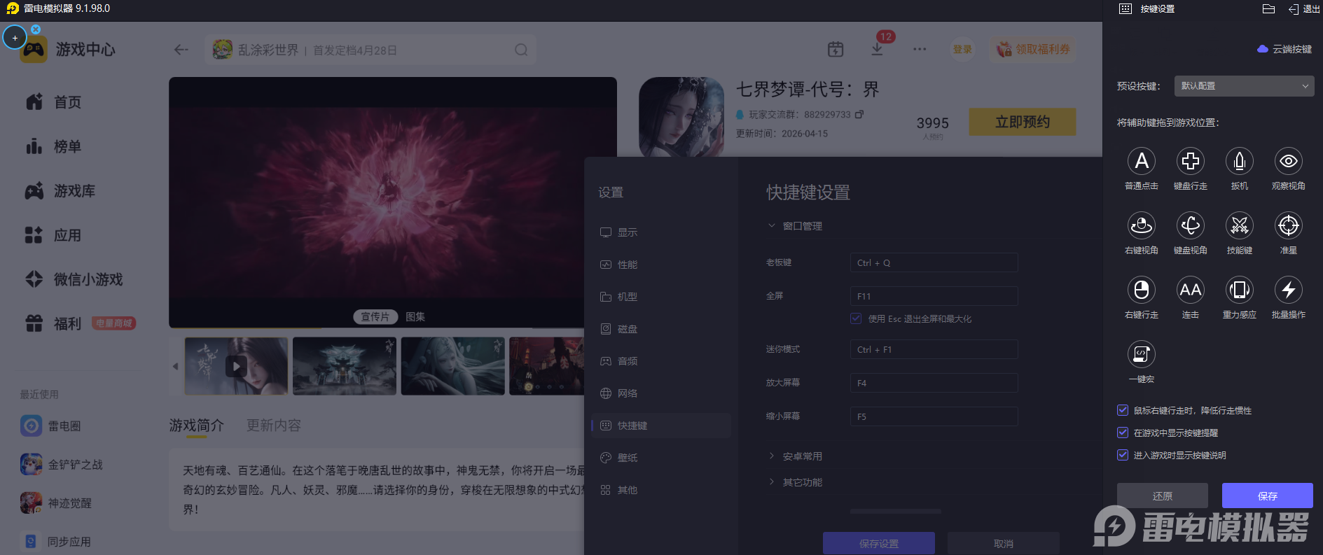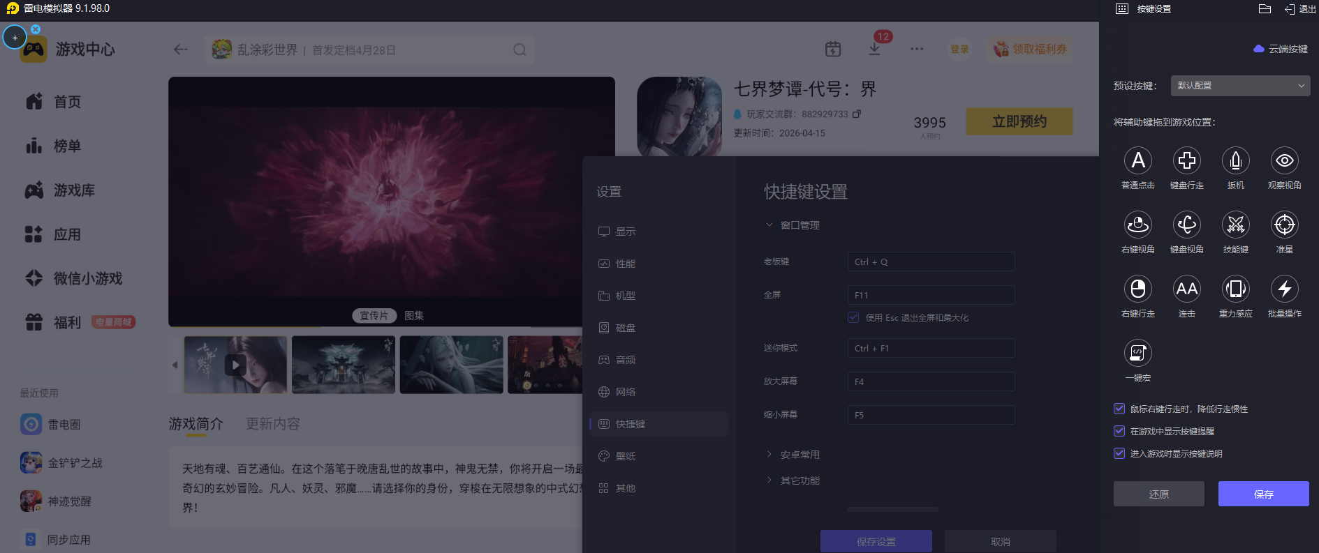 七界梦谭核心玩法包含化形切换、断招弹反等特色战斗机制,实战过程中需要灵活切换技能和把控操作节奏,简单触屏触控很难精准契合高强度对战操作需求。雷电模拟器支持专属键鼠按键自定义设置,适配游戏各类战斗操作逻辑,实现精准快捷的指令触发,轻松适配游戏各类高阶对战和探索玩法操作需求。