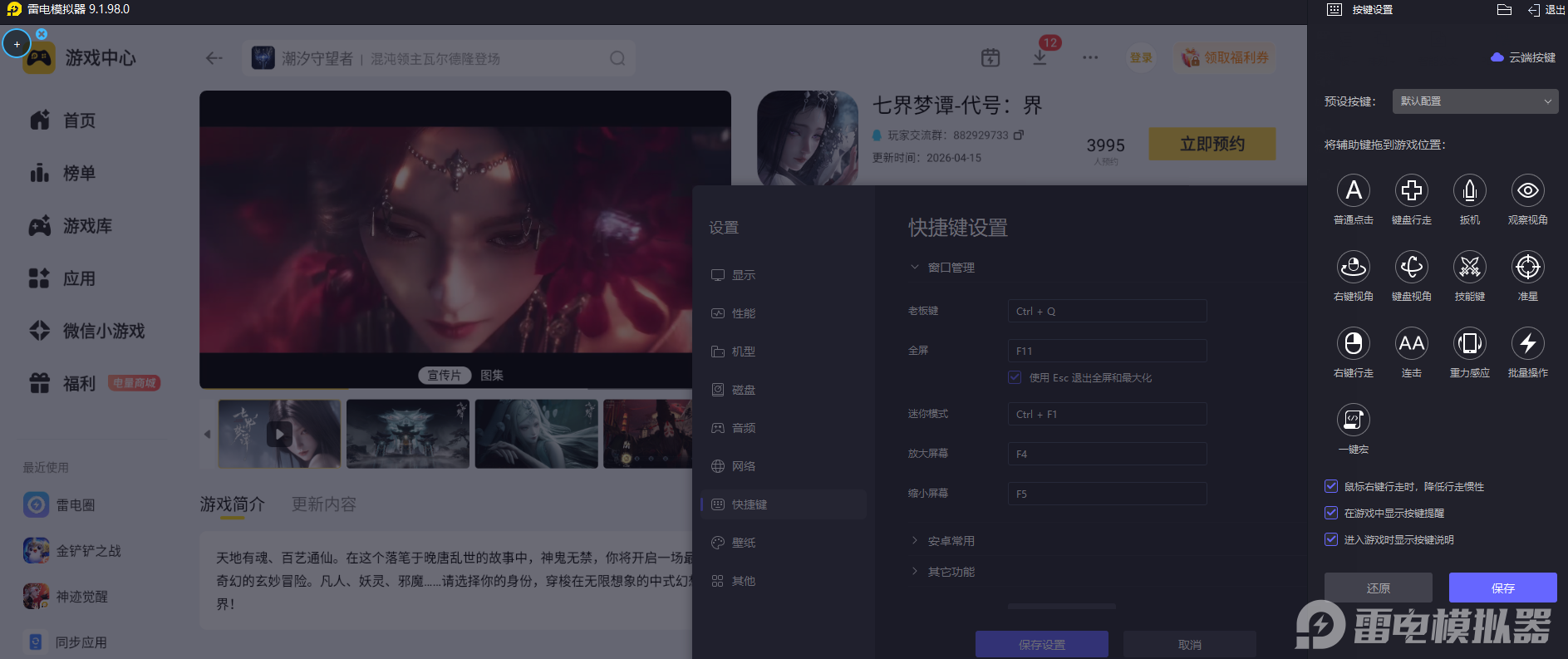 七界梦谭主打自由化形战斗和灵活技能连招玩法,战斗过程需要频繁切换形态、释放连招和走位闪避,操作连贯性要求比较高。雷电模拟器适配专属键鼠按键自定义布局,按键操控响应精准灵敏,轻松完成各类高难度连招和走位操作,适配核心战斗游玩需求。