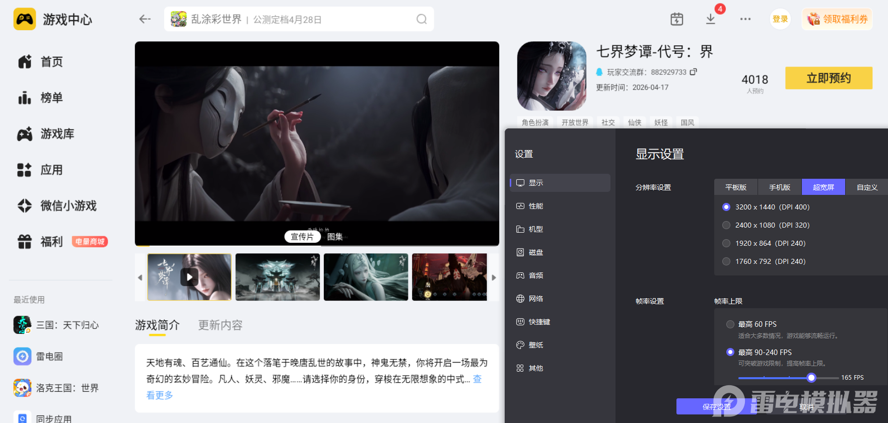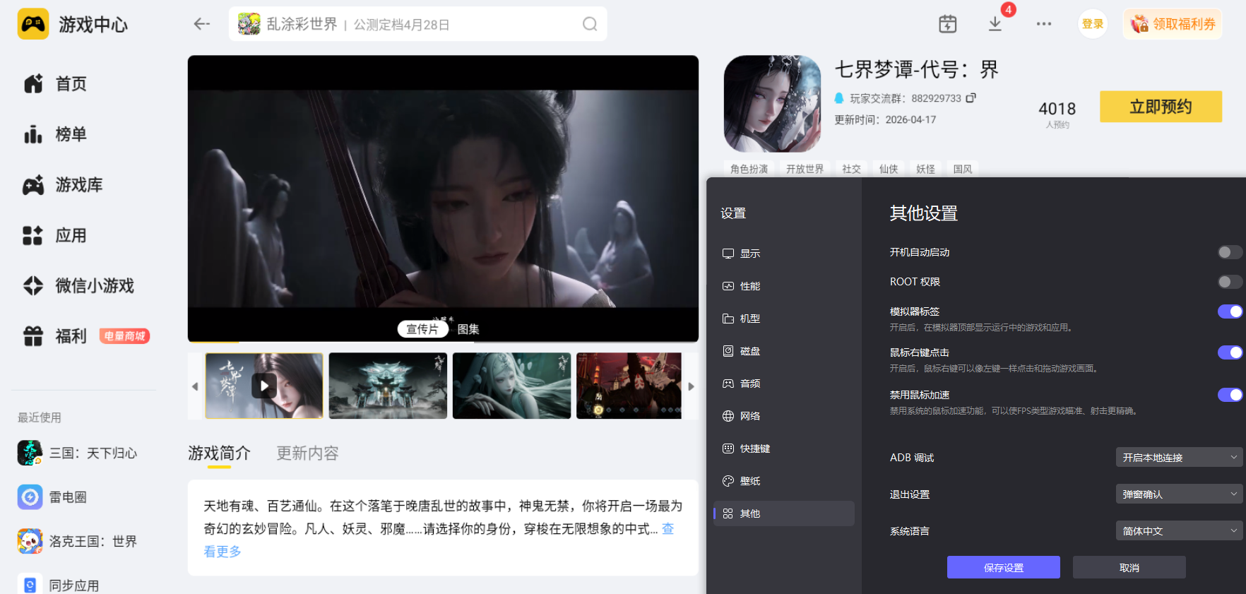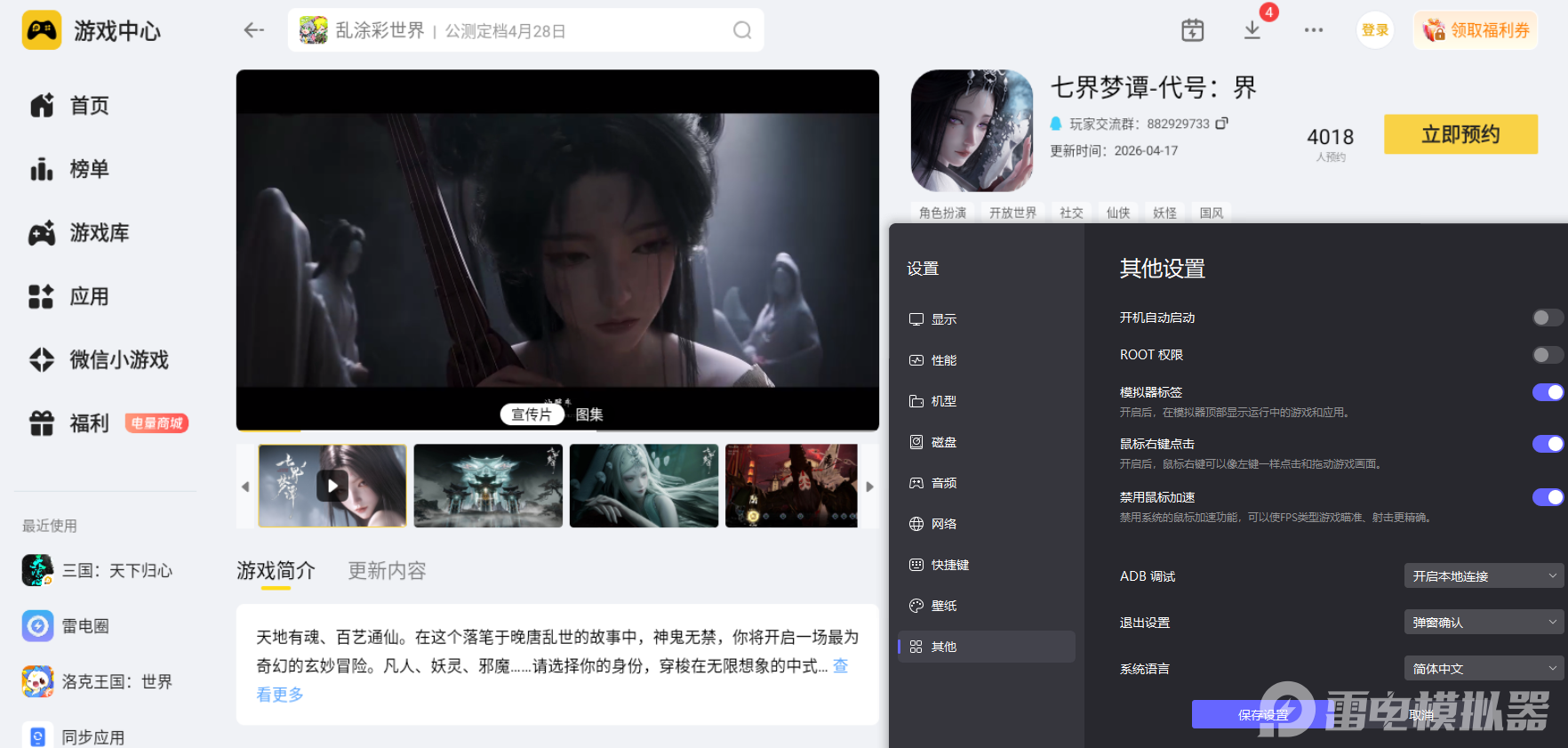 大家如果想要沉浸式感受七界梦谭完整的仙侠游玩内容,可以使用雷电模拟器在电脑上玩七界梦谭手游,能够全方位提升整体游玩质感,解锁手机端无法比拟的游玩氛围,让每一次探索冒险和对战闯关都能拥有更好的整体感受。