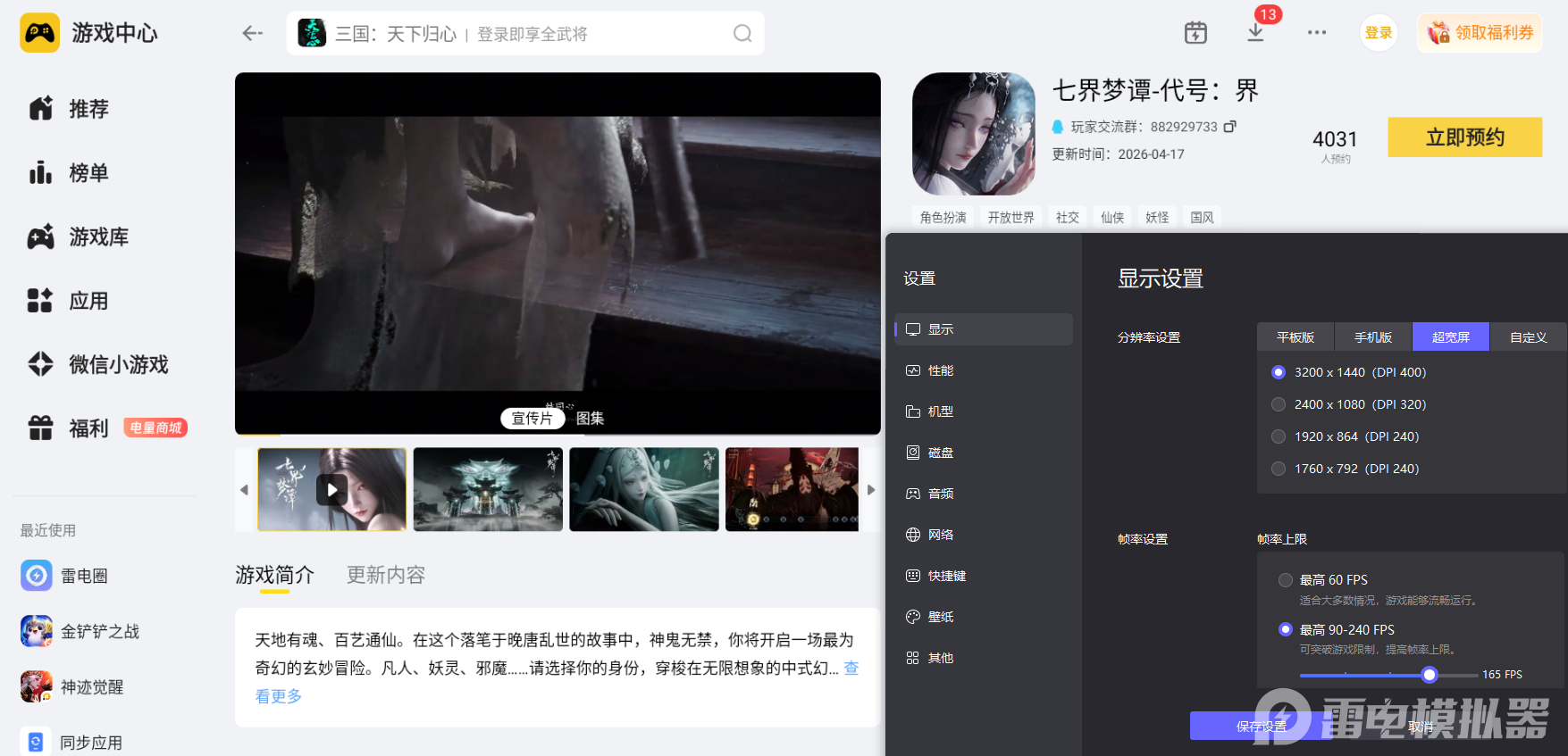 七界梦谭有着细腻的七界场景与丰富的角色技能特效,开荒时需要清晰观察战场局势、寻找隐藏资源、查看场景细节,雷电模拟器的4K分辨率+165稳定帧率可以完整还原游戏画面的每一处细节,视野更开阔,画面展现更清晰,能轻松捕捉开荒所需的各类信息,让探索与闯关更顺利。
