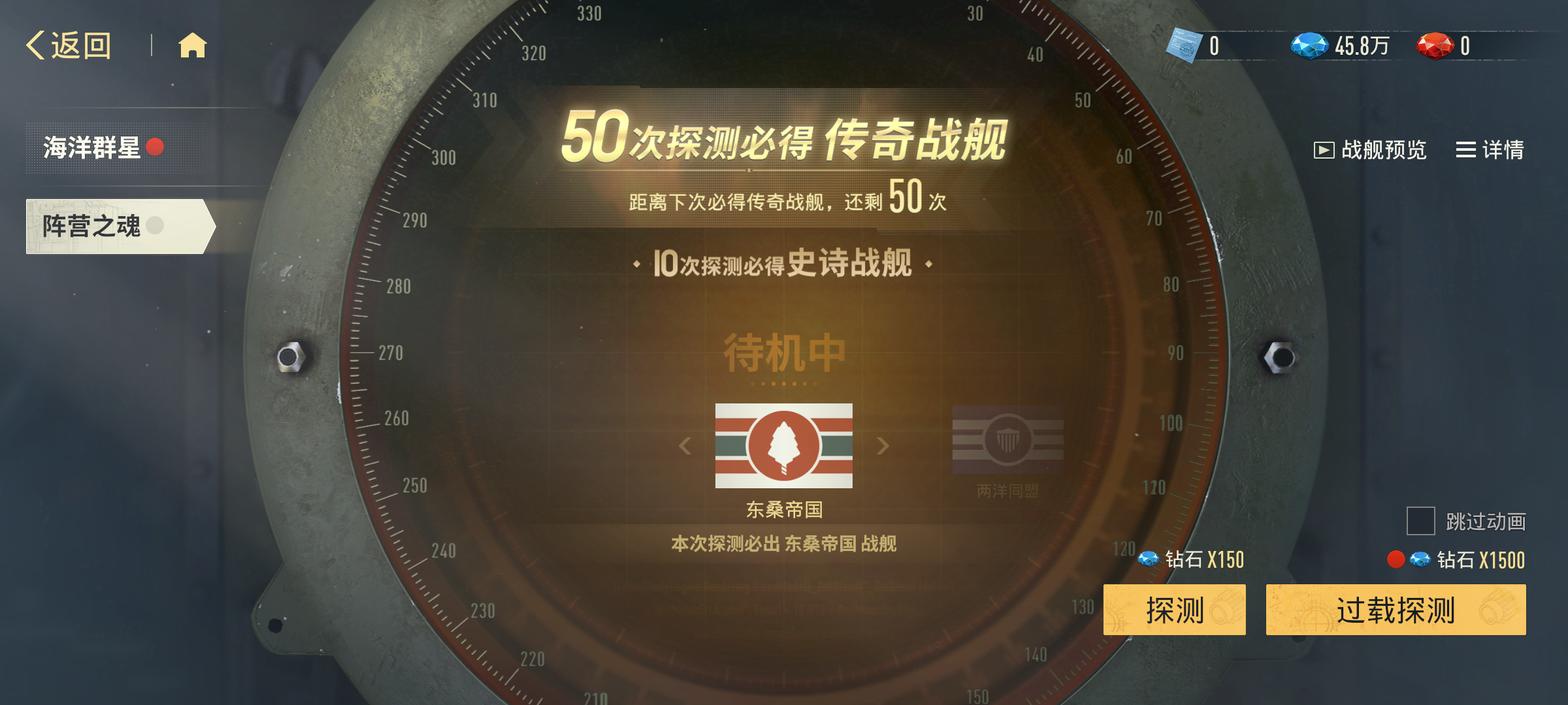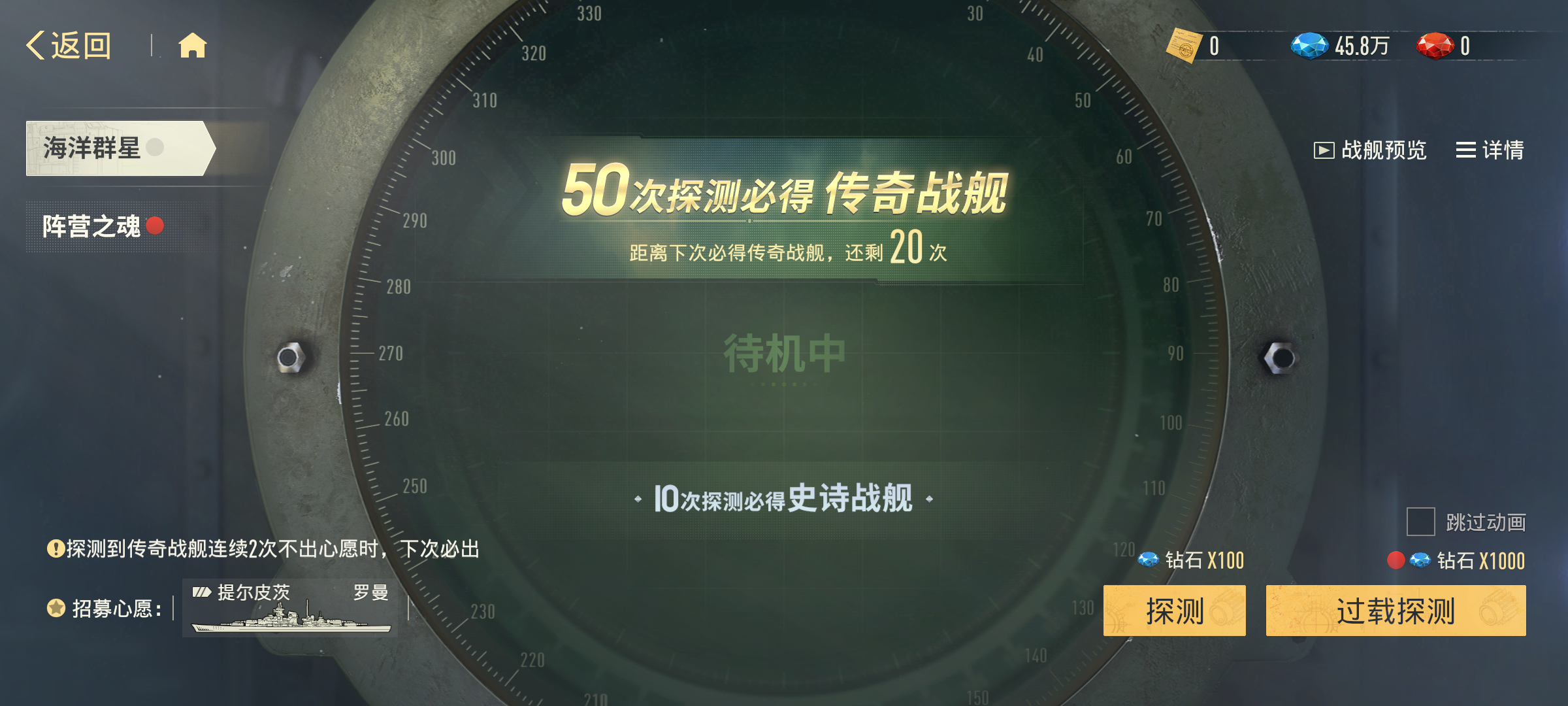 ♦ 海洋群星:可使用蓝钻或舰队密函进行探测,每50次探测必定获得传奇战舰,并且可以设定心愿战舰来提升特定战舰的探测概率。