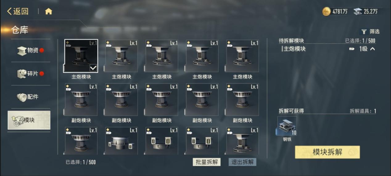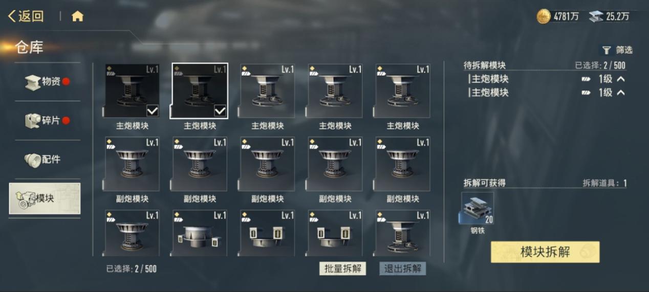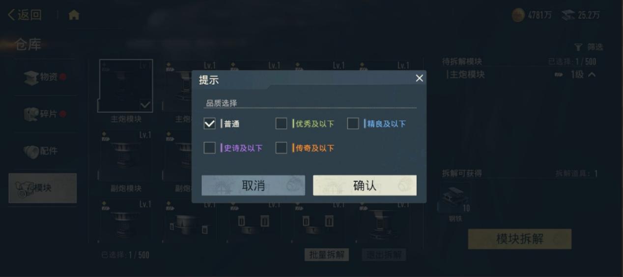 在批量拆解窗口中,可按品质筛选并批量选择。右侧会实时显示拆解后返还的材料明细。