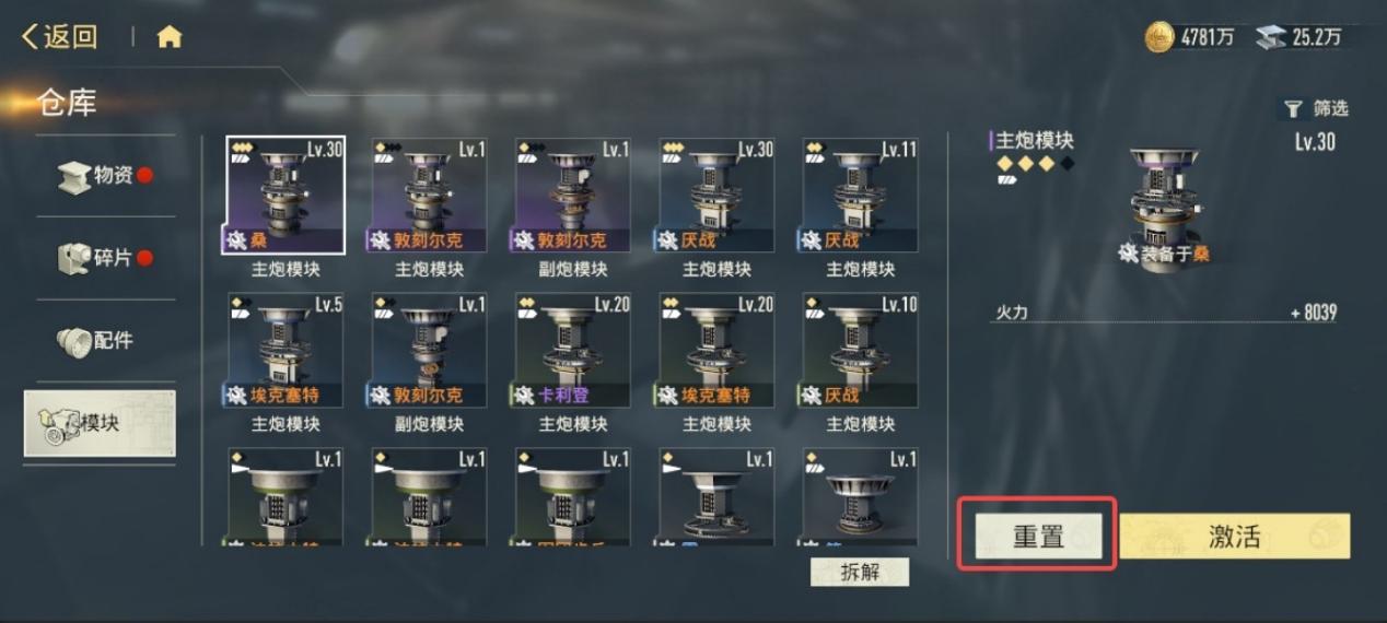 选择“重置”后,将返还升级材料。合理利用资源,培养出更强力的模块吧。