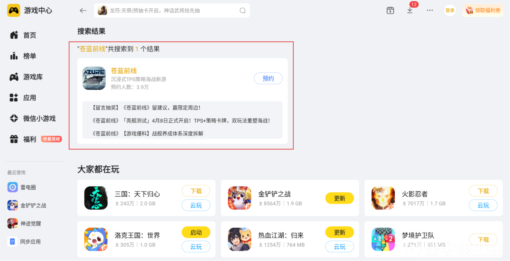 大家先在雷电模拟器官网下载安装最新版本的雷电模拟器,安装完成后打开模拟器主界面,在雷电游戏中心输入游戏全称找到对应游戏专区,点击页面内的预约按钮完成一键预约即可。后续游戏开启公测上线后,模拟器会自动下载,不用额外查找下载资源就能直接进入游戏。