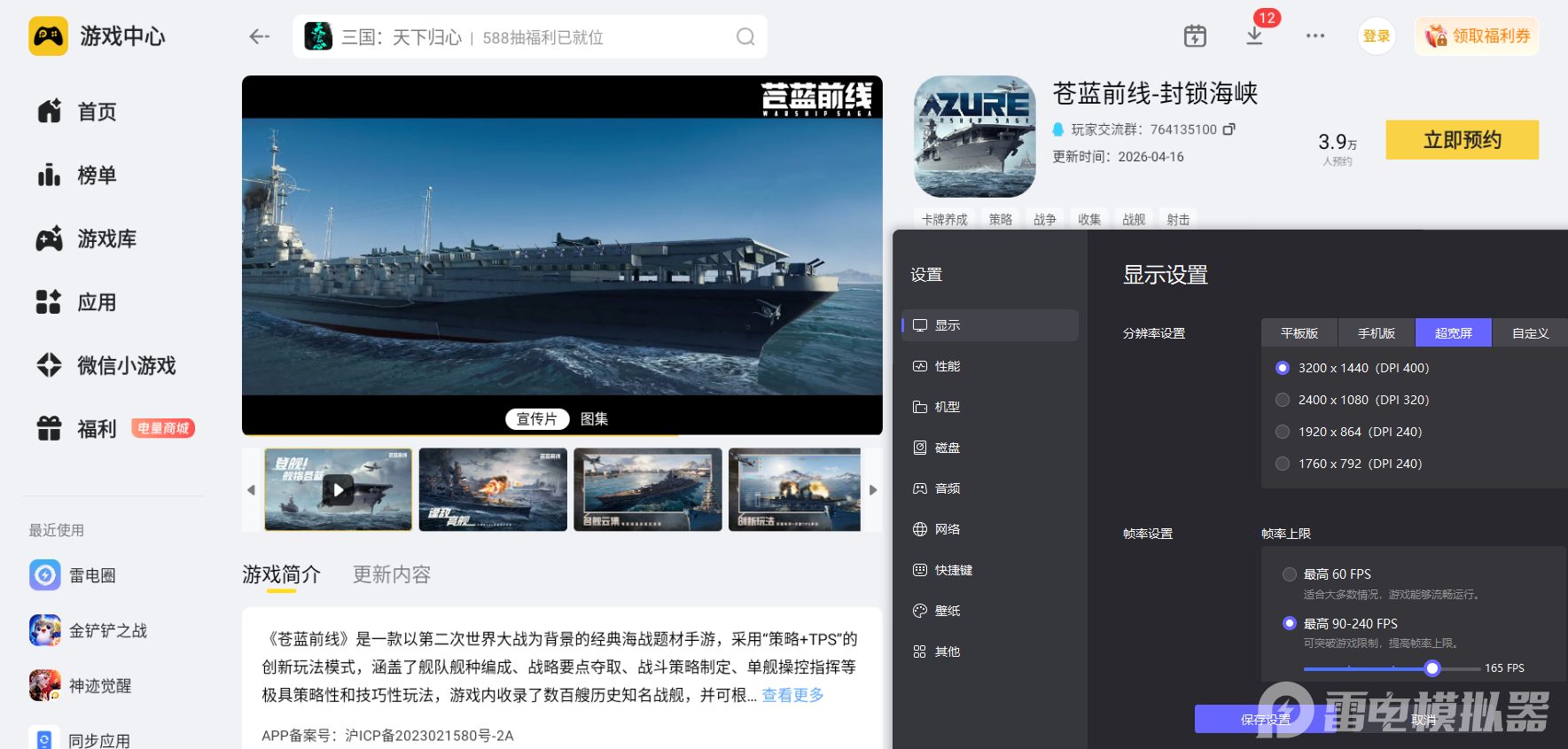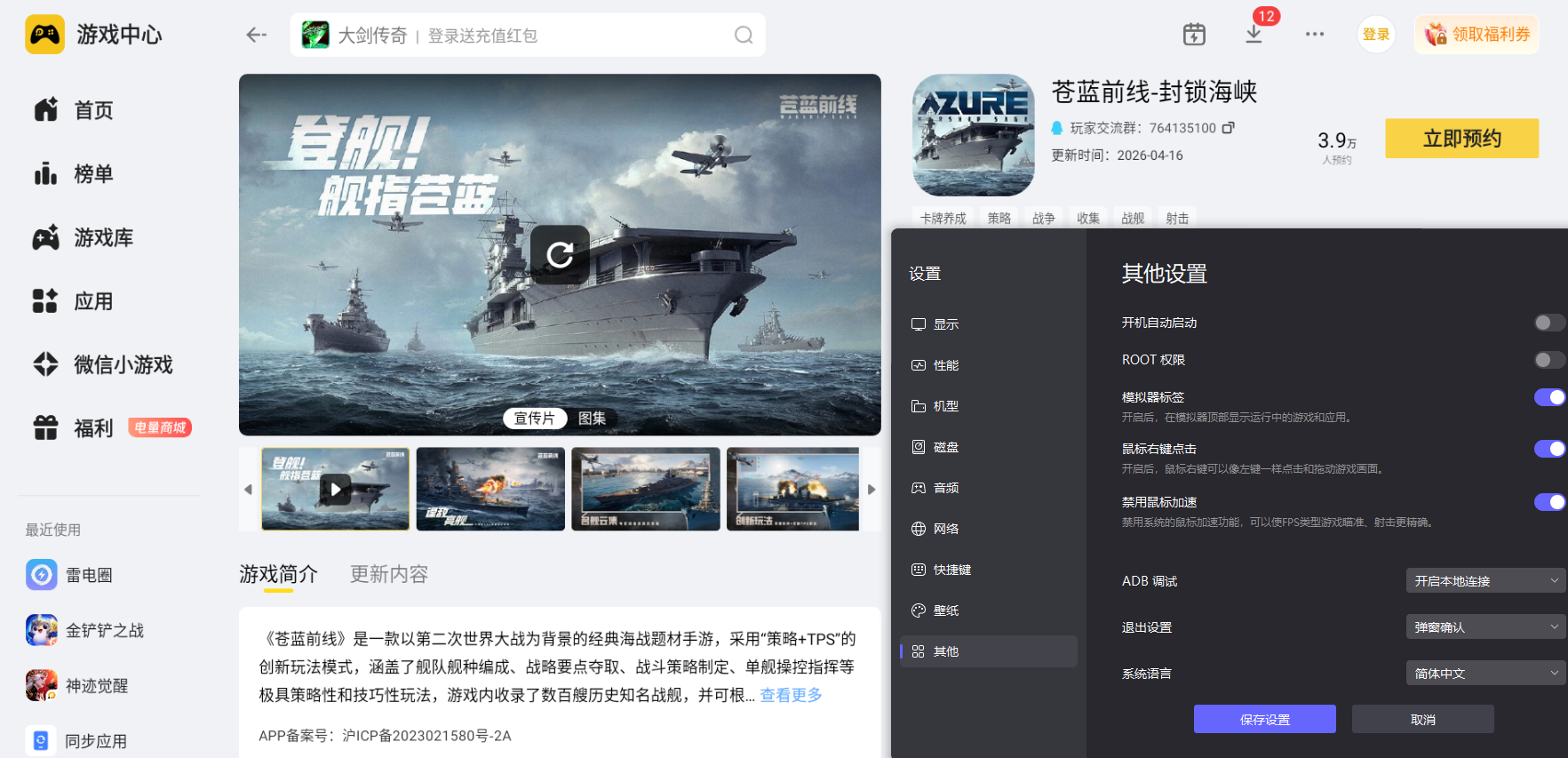 苍蓝前线主打真实海上战舰对战和多舰队协同策略对决,游戏里需要操控战舰灵活转向瞄准,还要搭配不同舰种组建作战编队,完成各类港口探索和战役闯关内容。结合游戏整体的对战节奏和养成玩法特点,想要在电脑上稳定体验完整游戏内容,选用雷电模拟器来运行苍蓝前线手游是最合适的选择,适配性拉满还能贴合游戏所有核心游玩需求。