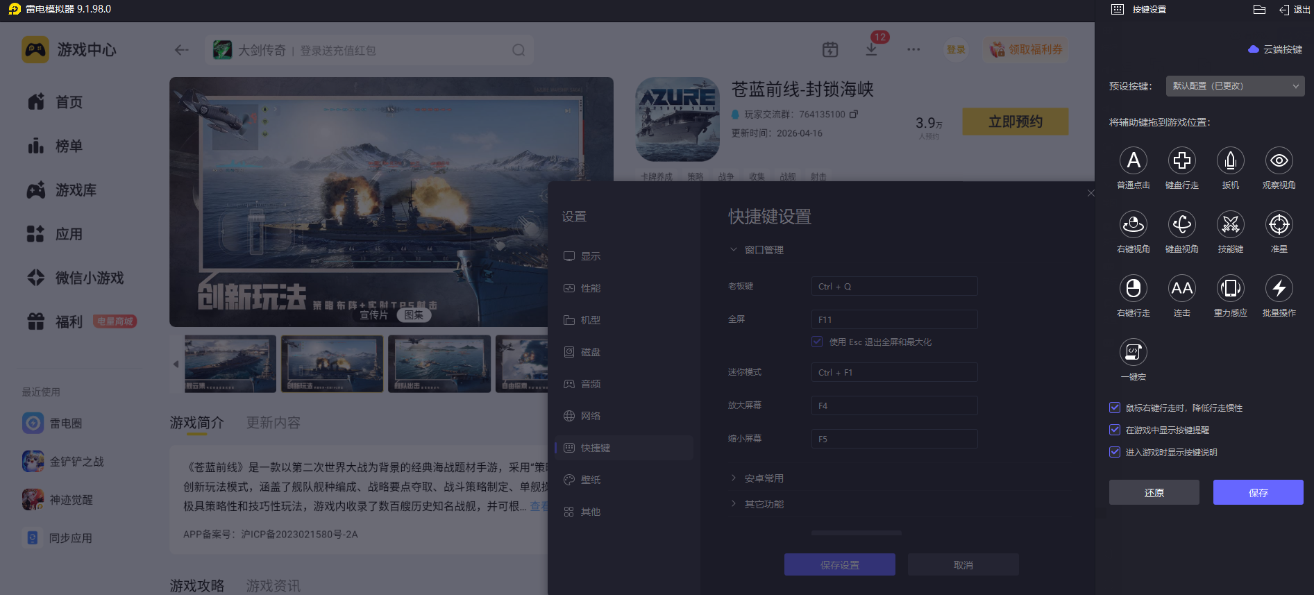 苍蓝前线实战对战需要精细完成战舰转向、弹道瞄准和武器切换等操作,频繁的操作指令在雷电模拟器支持自定义电脑键盘按键适配,能够按照海战对战习惯设置专属操控按键,精准对应战舰移动、开火、切换舰队等游戏操作,贴合游戏实战对战节奏,轻松完成各类精细对战操作指令。