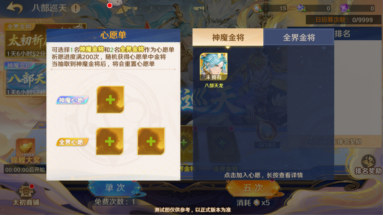 心愿单目标的变更:招募过程中未获得心愿单目标全界金将时,守护使可随时更换心愿单全界金将,但如果招募到了心愿对应全界金将,则对应的心愿目标会标注为已抽取,不可更换其他神将。若招募获得了心愿单中的神魔金将,则心愿单将会重置。