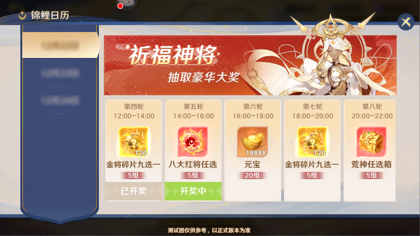 5、锦鲤大奖包括金将碎片九选一*120、八大红将任选、元宝*18888、荒神任选箱等奖励!
