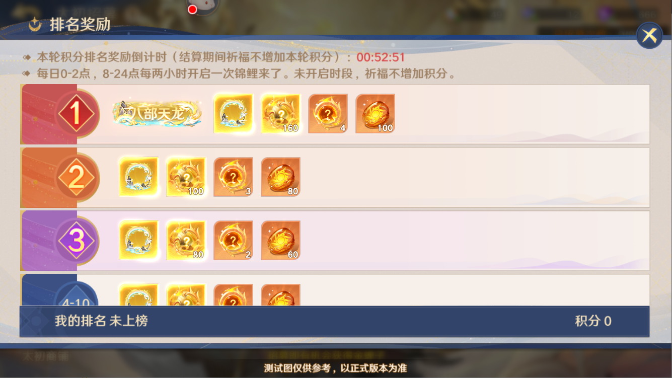 1、活动期间每日0:00-2:00、8:00-24:00,每2小时开启一次积分排名;