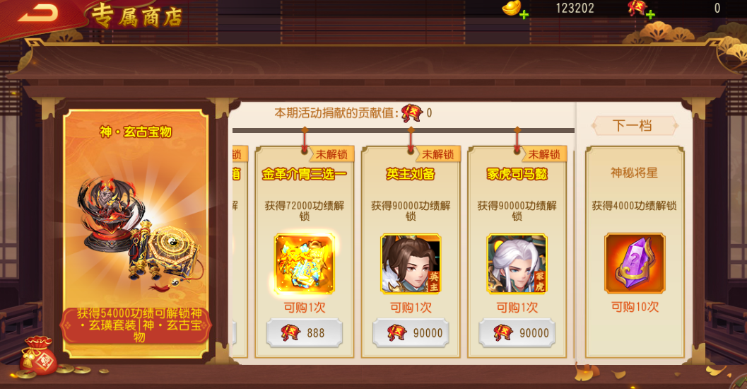 在个人专属商店中,只要主公在本次活动中个人获得的功绩达到指定条件就能解锁稀有资源的兑换,九霄装备、金色宝物、限定武将英主刘备和冢虎司马懿,同时还有附魔丹、大荒策、山海经商品出售!