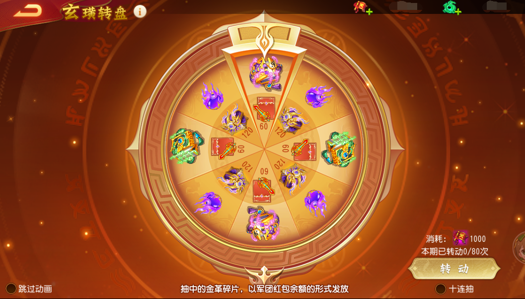 单次活动功绩达到要求后开启玄璜转盘,主公可消耗功绩进行转盘玩法,从玄璜转盘中获得玄古宝物碎片、玄璜装备碎片、附魔养成材料、金革碎片红包余额等道具。