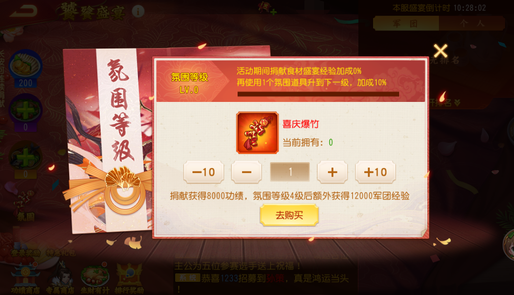 饕餮盛宴热闹不可少,小乔作为气氛组必须到位。氛围道具助力主公盛宴等级再上一层楼,主公捐献[喜庆爆竹]可以提升氛围等级,捐献富贵富足、生财有计即可获得经验加成,最高可达50%!10级不是梦,快和小伙伴一起参与吧。