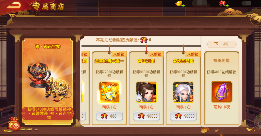 在个人专属商店中,只要主公在本次活动中个人获得的功绩达到指定条件就能解锁稀有资源的兑换,九霄装备、金色宝物、限定武将英主刘备和冢虎司马懿,同时还有附魔丹、大荒策、山海经商品出售!