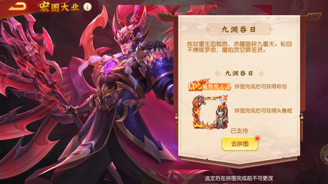 主公进入宏图大业活动界面后,可以选择其中一个阵营,选定之后在支持阵营的拼图没有完成之前不可更改,己方阵营拼图完成后可以给对方拼图捐献颜料。
