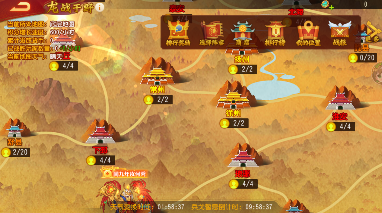 1)每天的10:00-22:00为征战期,主公可以在城池中查看该城池有哪些其他主公,并选择目标主公对其进行驱逐并进入战斗。每日的22:00至次日10:00为休战期,主公不可驱逐其他主公,但是可以互相切磋。